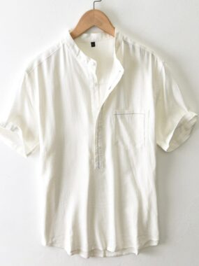 Men’s casual Mao collar T-shirt with a stylish button-up front. Perfect blend of modern and traditional design for everyday wear.