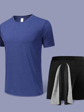 Stay cool and dry in this summer-ready mens fitness set includes a breathable quick-dry T-shirt and matching shorts.