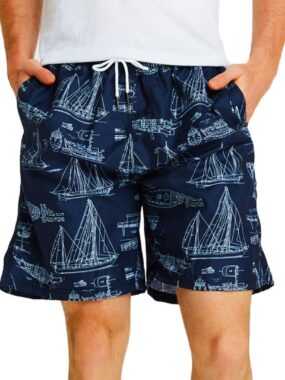 Stylish men’s navy swim trunks featuring a classic sailboat pattern, perfect for beach days or poolside lounging. Quick-dry and comfortable.
