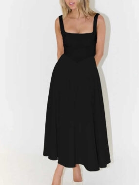 Elegant womens A-line midi dress with a square collar designoffering a flattering silhouette perfect for casual outings, brunches, or semi-formal occasions.