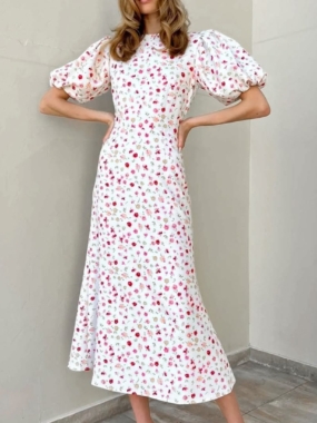 Flaunt timeless femininity in this Midi Floral Fitted Dress with charming puffed sleevesperfect for garden parties, brunches, or romantic evenings out.