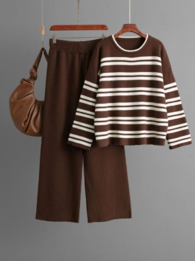 Trendy striped sweater paired with wide-legged pants for a chic, relaxed look.