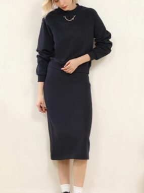 Elevate your everyday style with this chic autumn & winter setfeaturing a high-quality elastic waist skirt with back slit and a cozy round neck sweater.