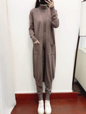 Elevate your seasonal style with our High-End Viscose Blend Knitted 3-Piece Set, featuring a long coat, sleeveless high-collar vest, and wide-leg pants. Perfect for chic, comfortable, and versatile autumn and winter fashion.
