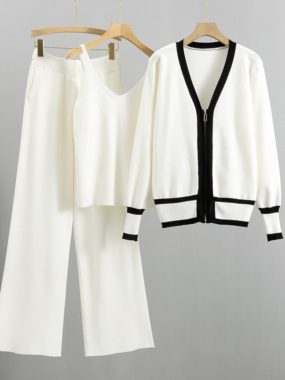 Upgrade your seasonal wardrobe with our Womens High Quality Knitted 3-Piece Set for Spring, Fall, and Winter. Featuring a long sleeve contrast color V-neck cardigan, a sleeveless V-neck top, and casual wide-legged pants, this set combines comfort, style, and versatility.