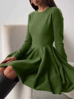 Look effortlessly chic in our Round Neck A-Line Knitted Mini Dress, designed for comfort and style.