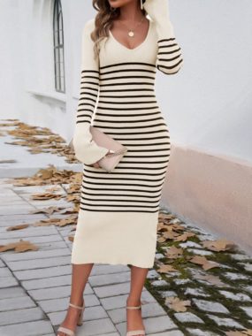 $39Chic and cozy, this contrast color striped knit dress features a flattering V-neck for effortless elegance.