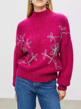$35Elegant and cozy, this embroidered high collar ribbed sweater combines detailed craftsmanship with warm comfort.