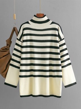 Comfort meets style in this loose fit striped turtleneck sweater, perfect for cozy, casual days.