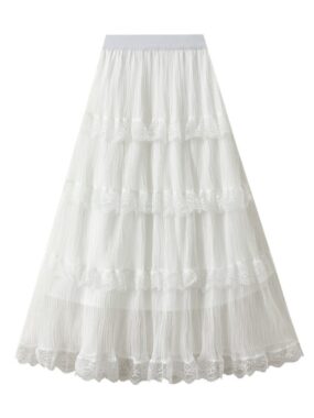 Delicate and dreamy, this layered pleated chiffon skirt with lace accents adds romance and elegance to any outfitperfect for special occasions or everyday chic.