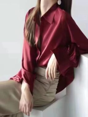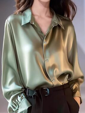 Elevate your wardrobe with this Womens Satin Classic Button-Up Blouse, designed for effortless elegance and all-day comfort. Its silky-smooth finish, timeless silhouette, and versatile styling make it perfect for work, evenings out, or special occasions.