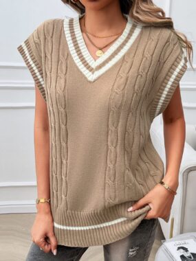 $27A sleek sleeveless ribbed sweater with a V-necklineperfect for effortless layering or solo styling.