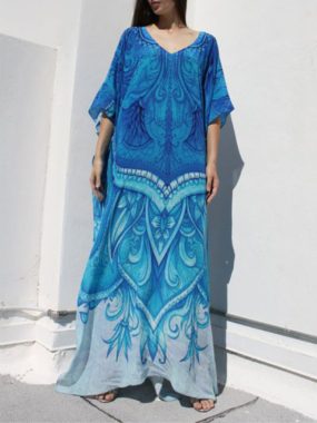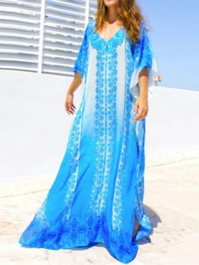 Vibrant printed beach lounge dress with a relaxed fit and flattering V-neckline.