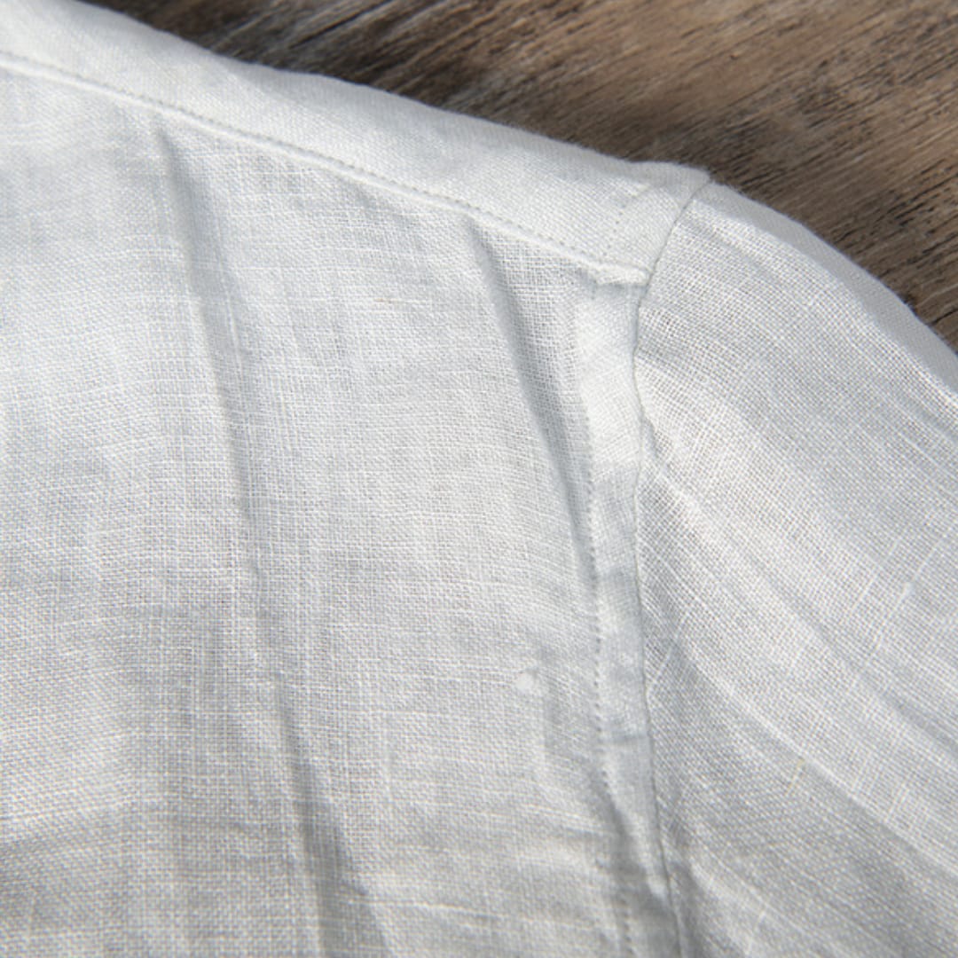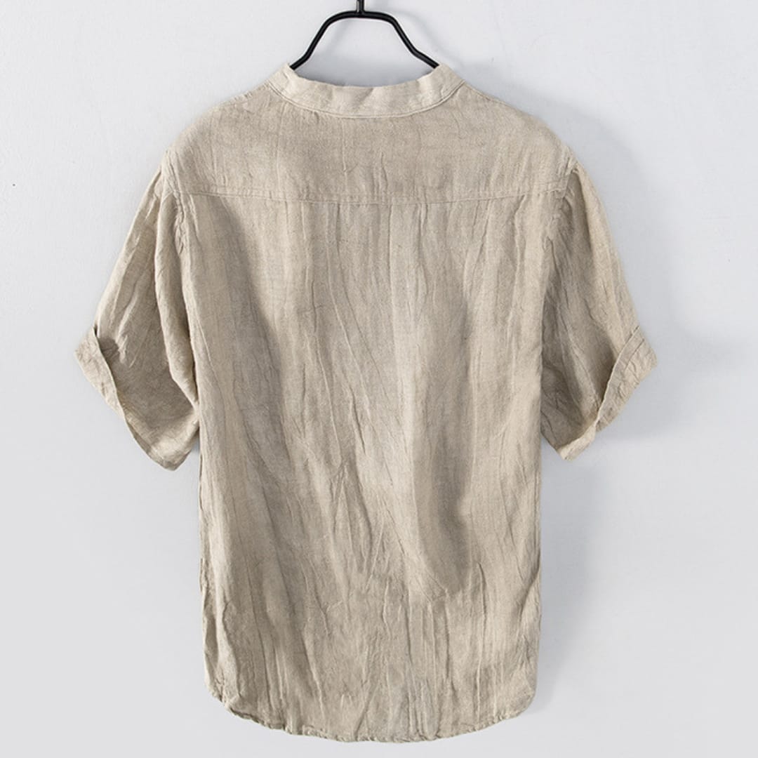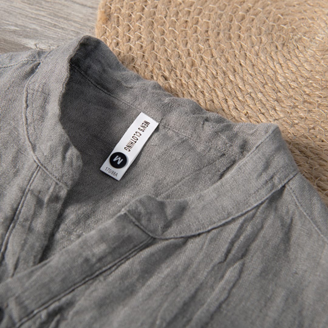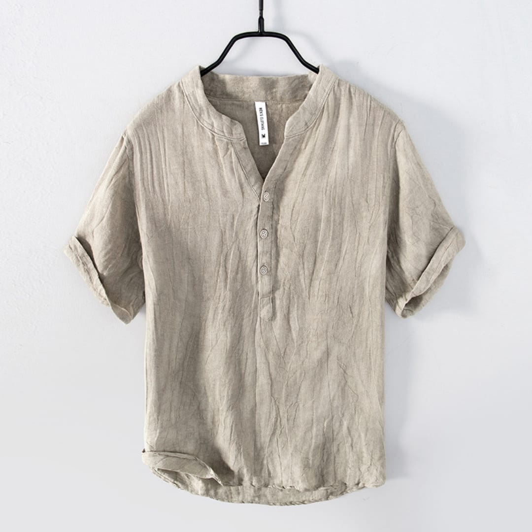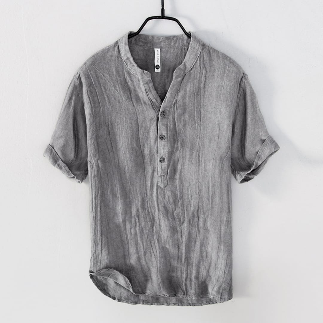 Minimalist 100% pure linen Mao collar t-shirt with a buttoned front, perfect for breathable, stylish summer wear.