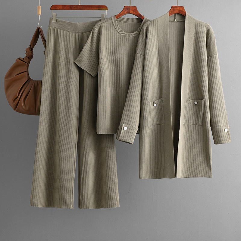 3 Pcs Knit Set Mid Length Cardigan, T-Shirt, and Casual Pants