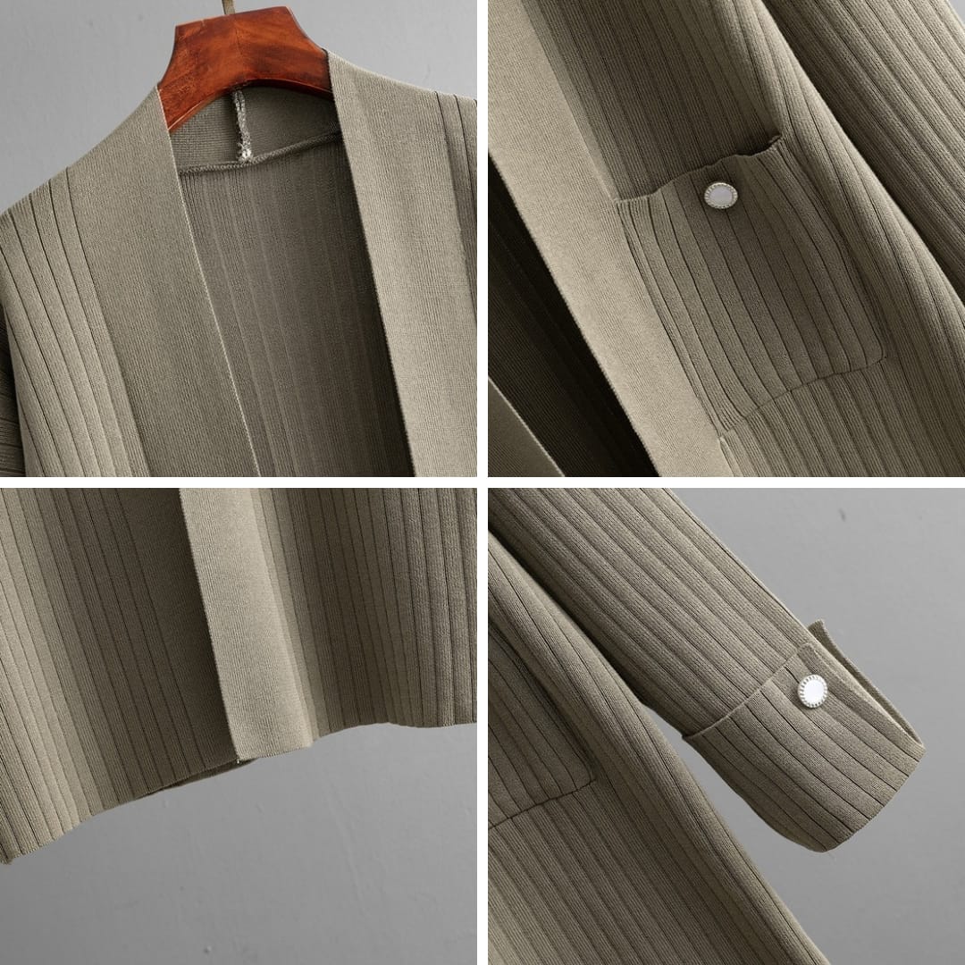 Elevate your cozy style with this Spring Fall Winter Knitted 3-Piece Set, featuring a mid-length cardigan, round neck T-shirt, and casual lounge pants — the perfect blend of comfort and sophistication.