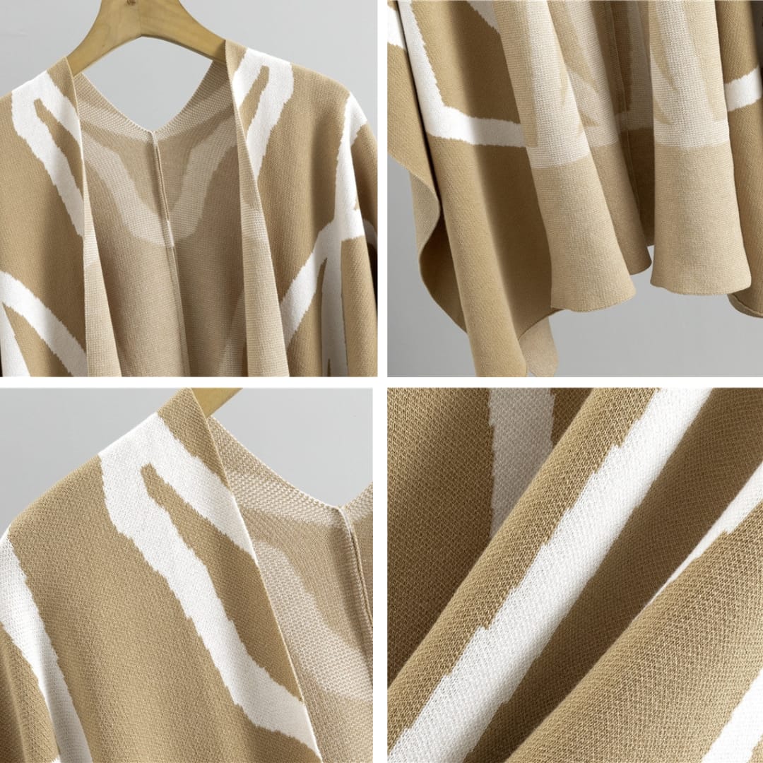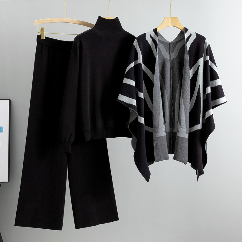 Stay stylish and cozy with our High-Quality Viscose Knitted 3-Piece Set, featuring a versatile shawl/cape, a turtleneck ribbed sweater, and casual wide-legged pants.