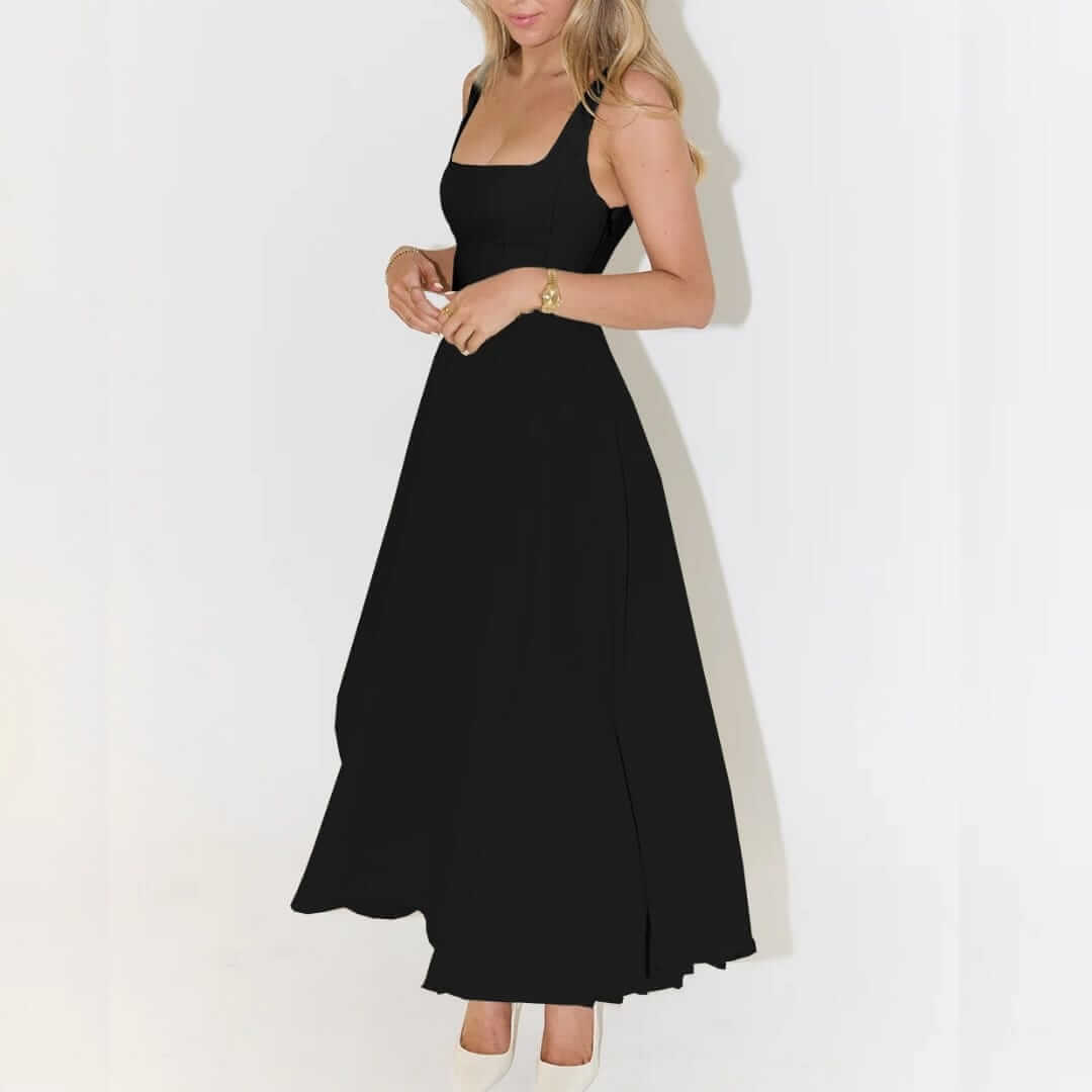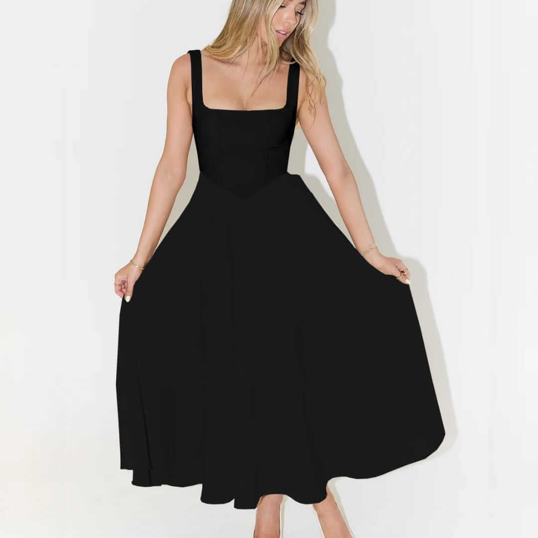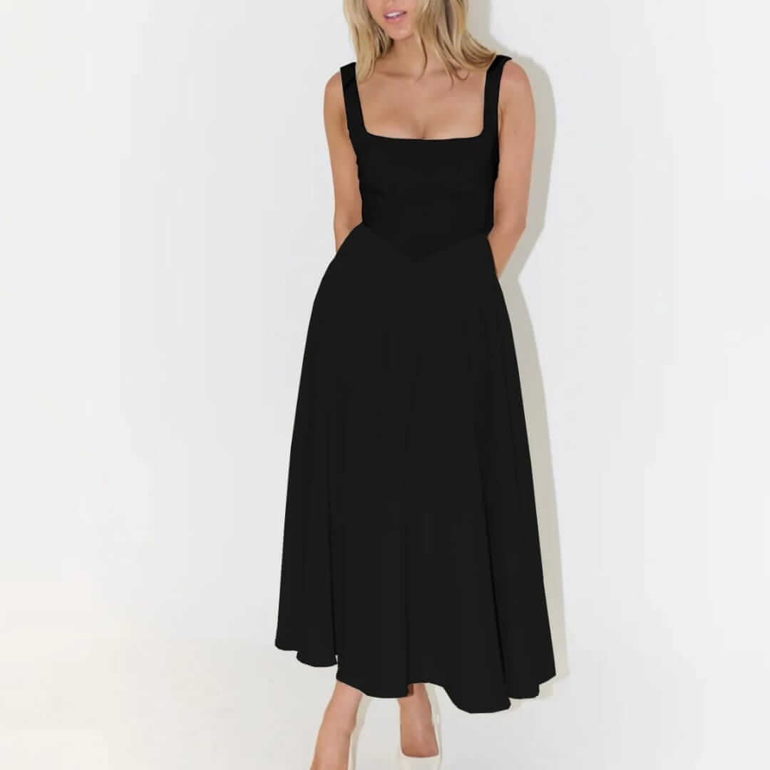 Elegant womens A-line midi dress with a square collar designoffering a flattering silhouette perfect for casual outings, brunches, or semi-formal occasions.