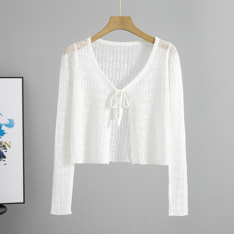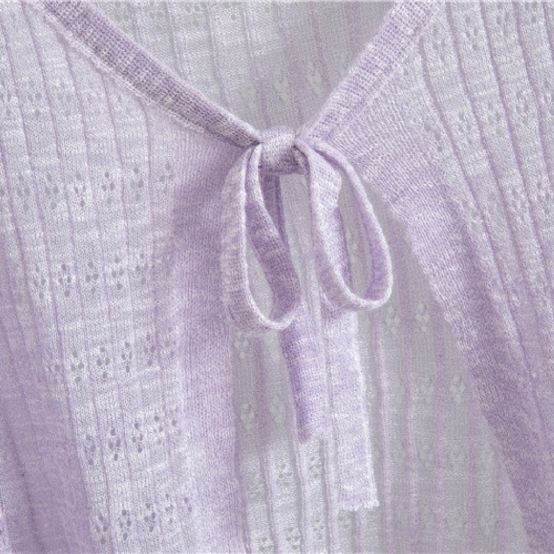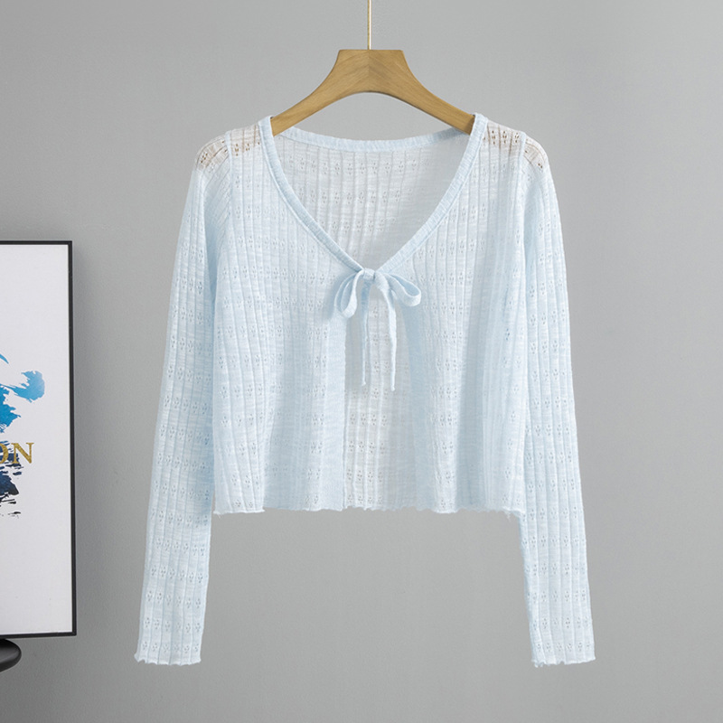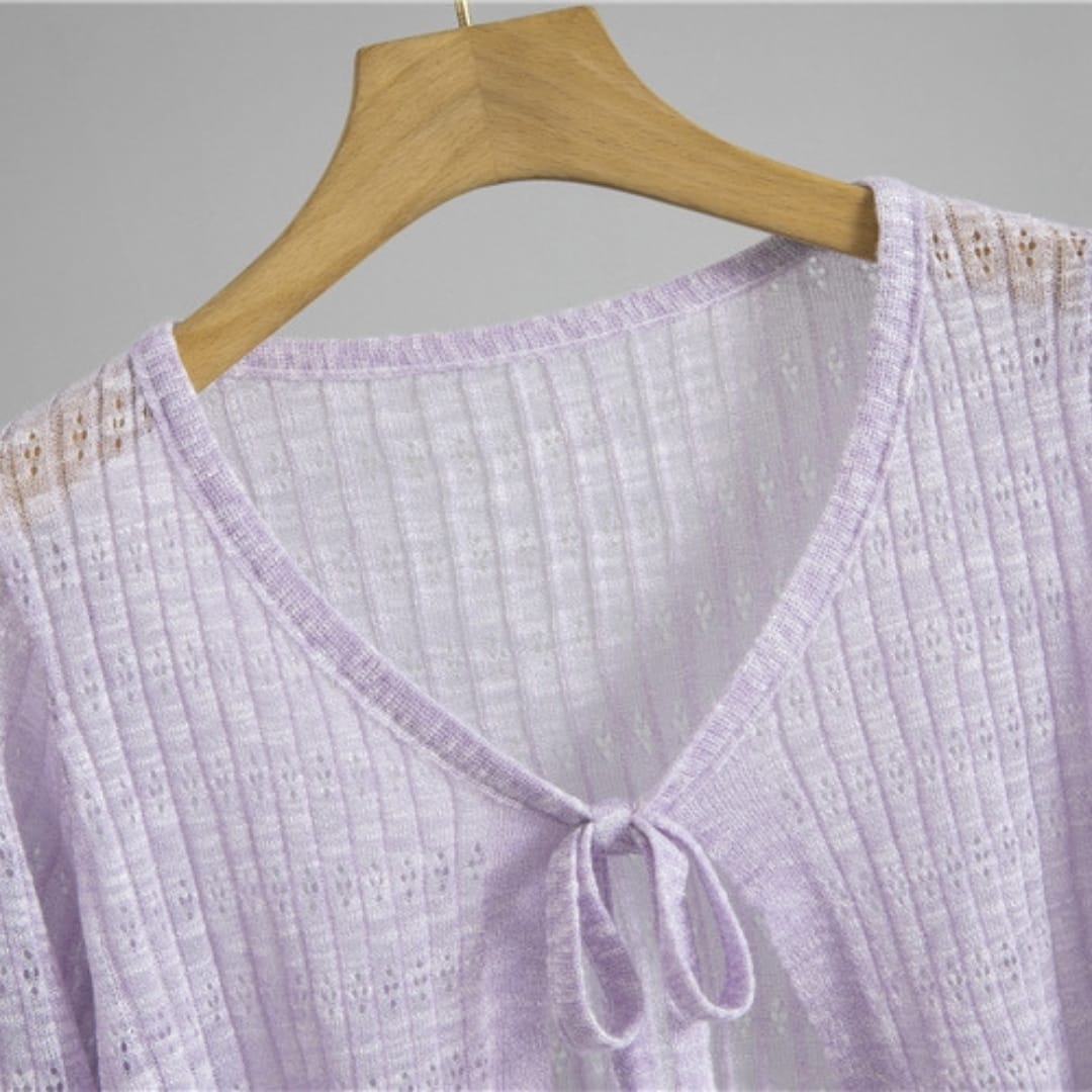 Add a touch of elegance to any outfit with our Women’s All-Year-Round Thin See-Through Textured Cardigan, featuring a delicate chest ribbon detail for subtle charm.