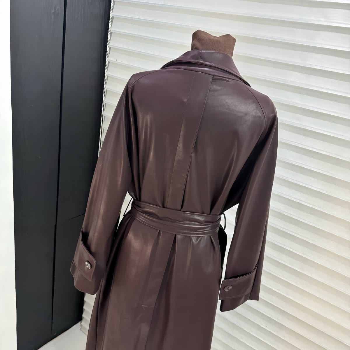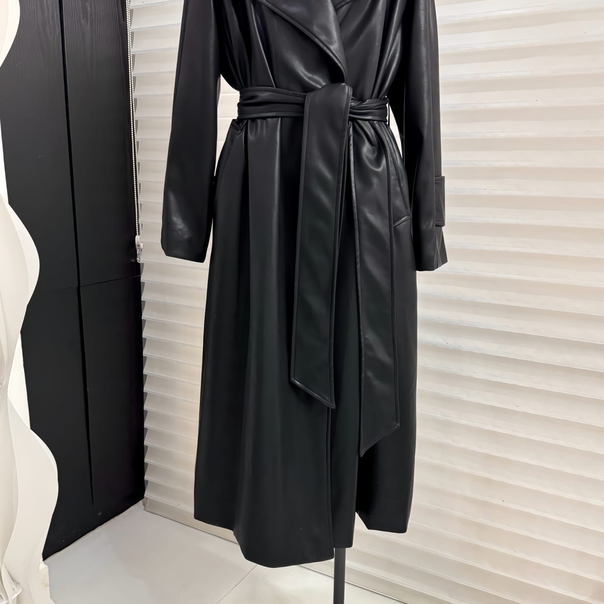 Step out in style with the Autumn Winter 2025/2026 Mid-Length Faux Leather Coat, featuring a large lapel collar, sleek leather belt, and a chic, modern silhouette for timeless seasonal fashion.