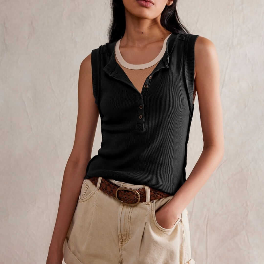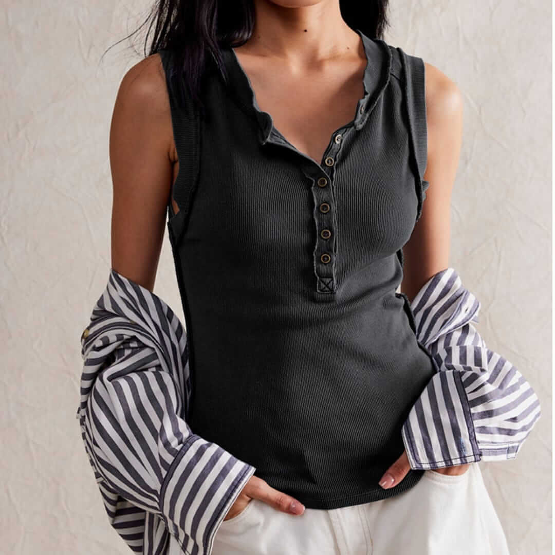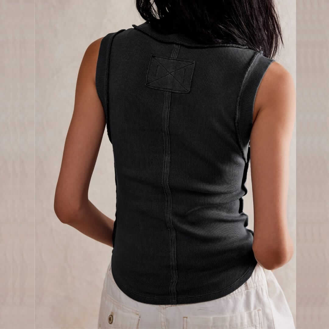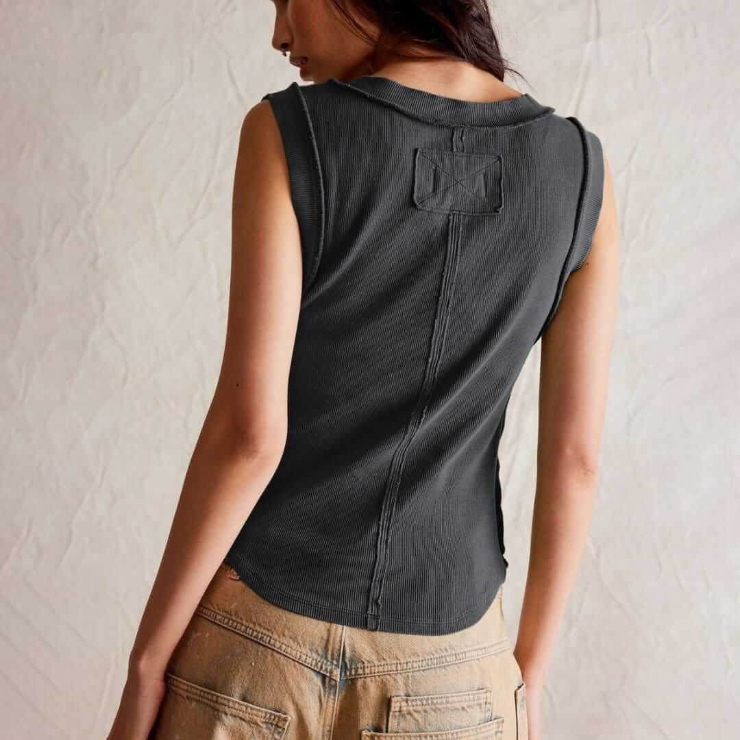 Womens boho unfinished ribbed sleeveless top featuring a textured design and raw-edge detailperfect for casual wear, layering, and effortless free-spirited style.
