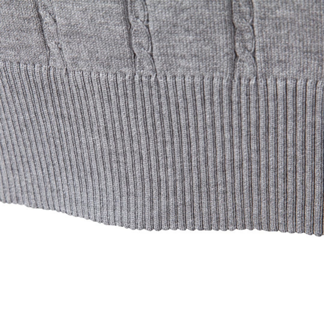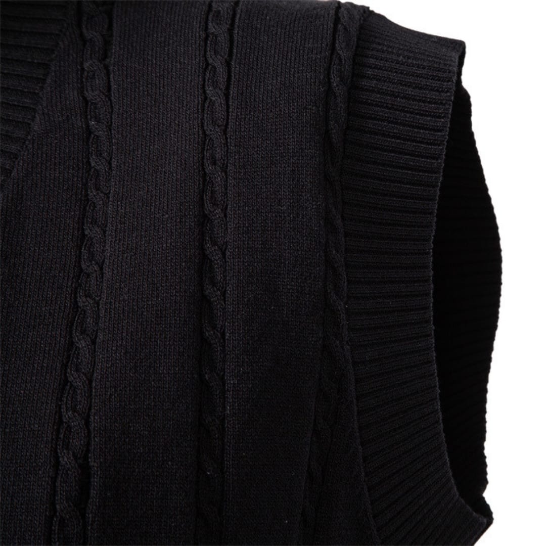 A stylish mens V-neck knitted sleeveless vest with textured design, perfect for spring and fall, offering lightweight warmth and versatile layering options.