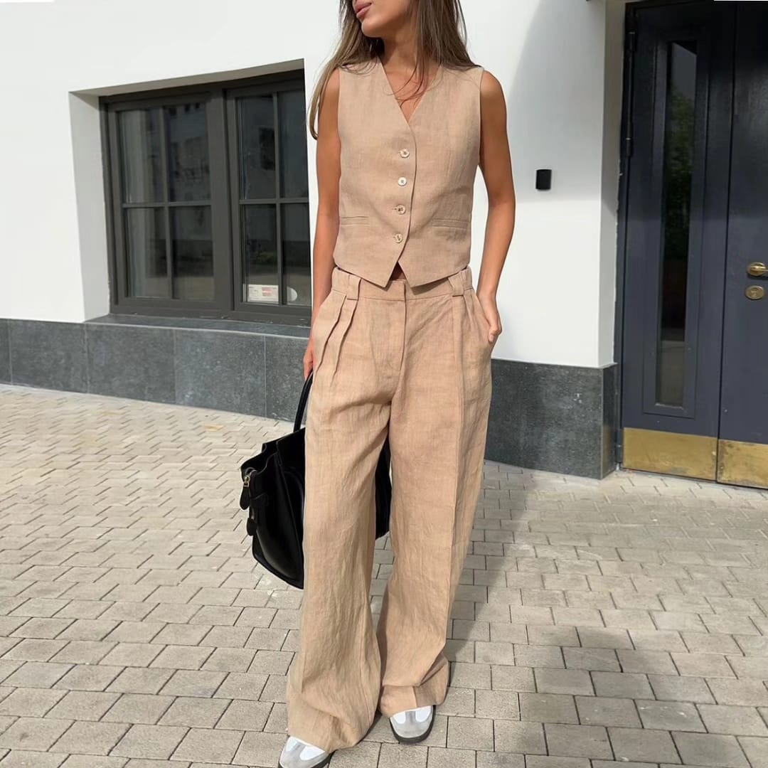 Trendy womens 2-piece summer casual set featuring a sleeveless vest and low-waist pants for a chic, relaxed look.