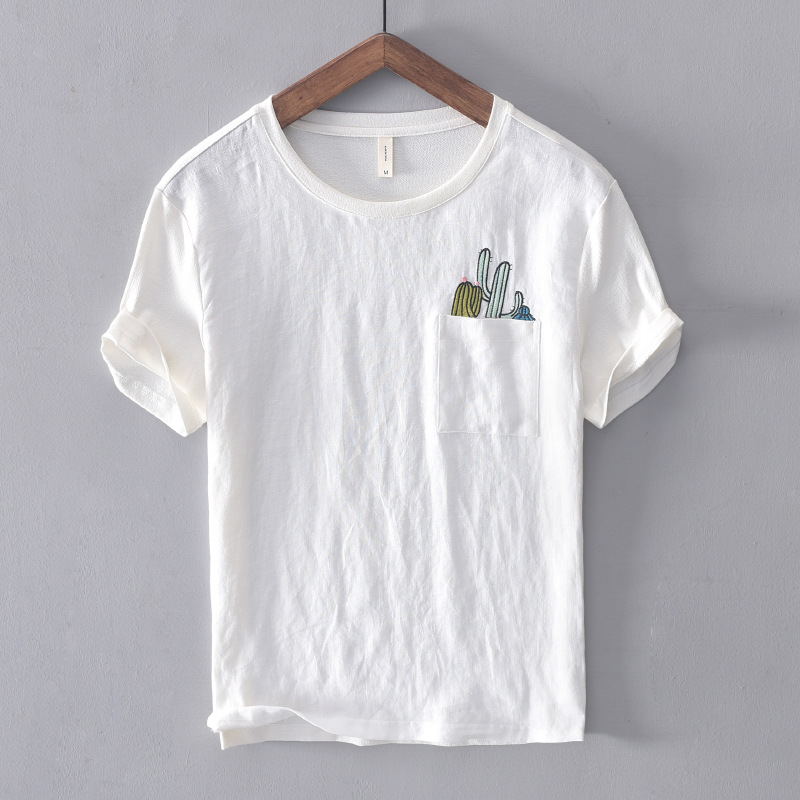 A relaxed casual tee featuring a stylish chest pocket and detailed embroidery perfect for daily wear.