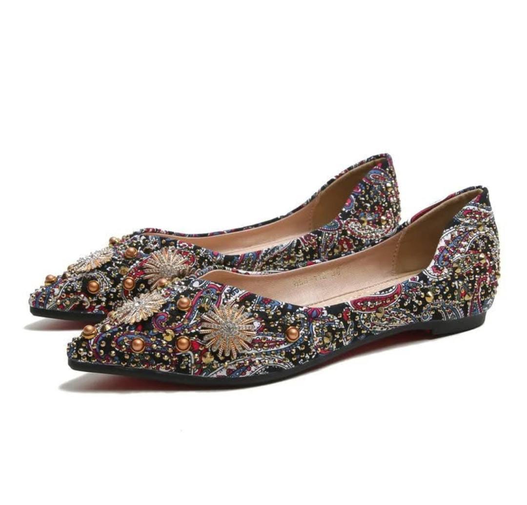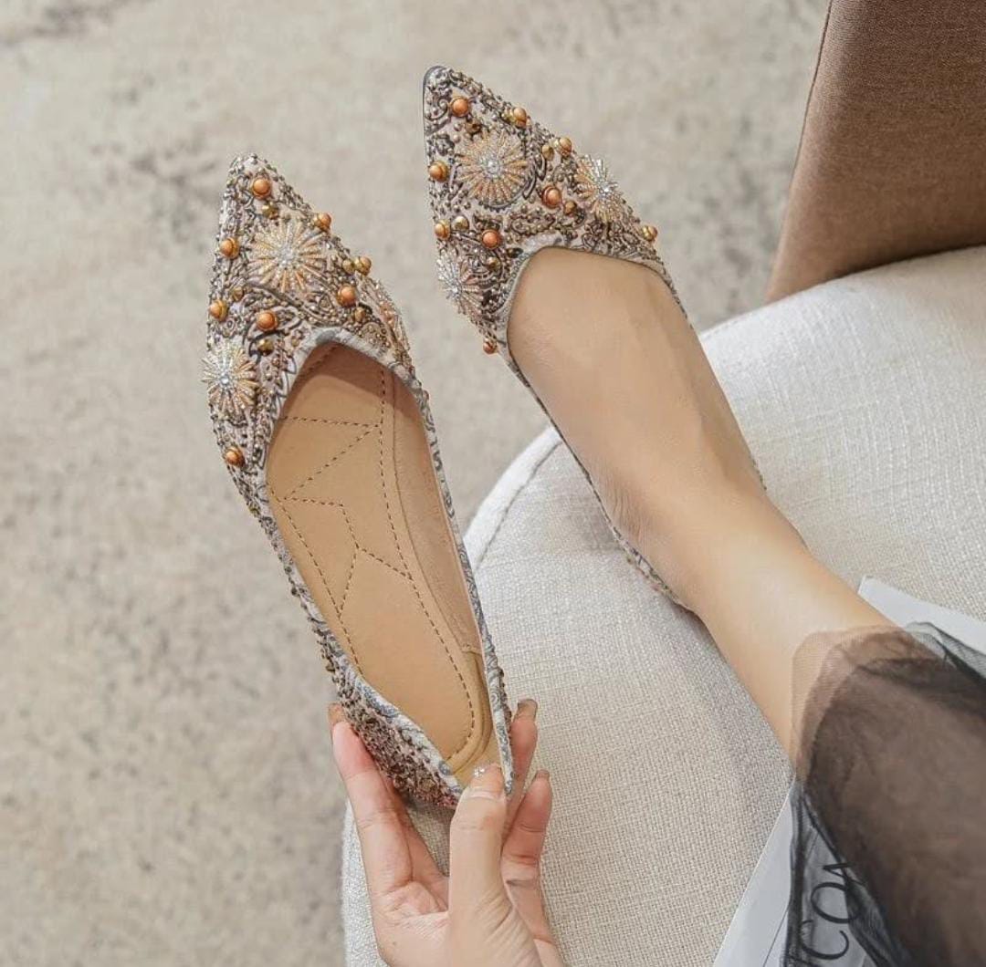 Step into elegance with these Womens Classy Pointed Toe Fully Beaded Flat Ballerinas, designed for effortless style and all-day comfort. Perfect for weddings, parties, and everyday chic wear.