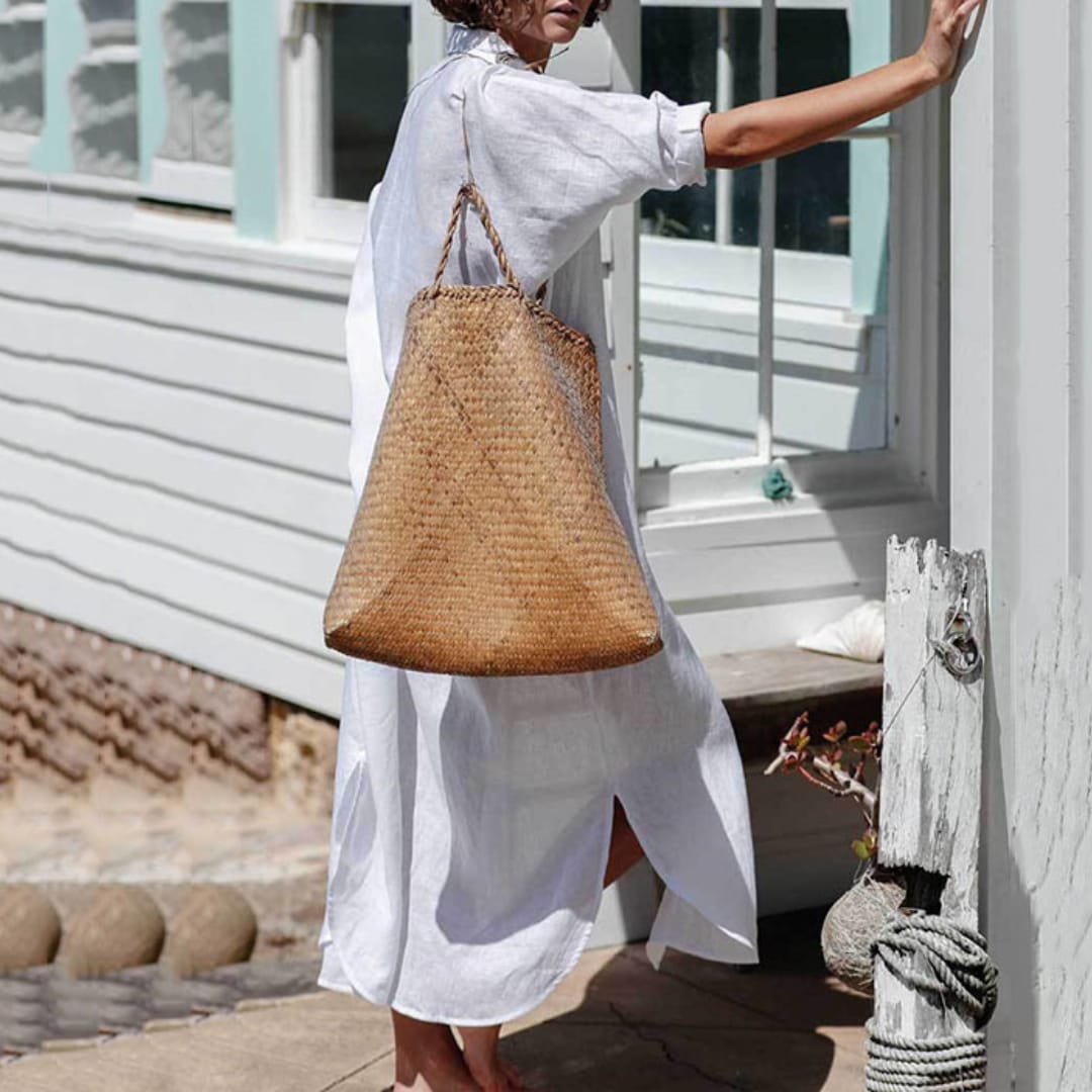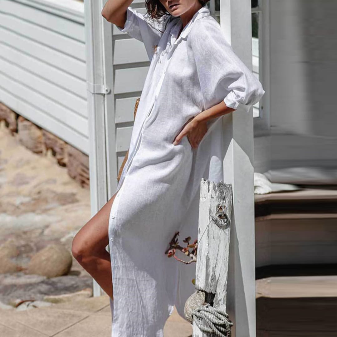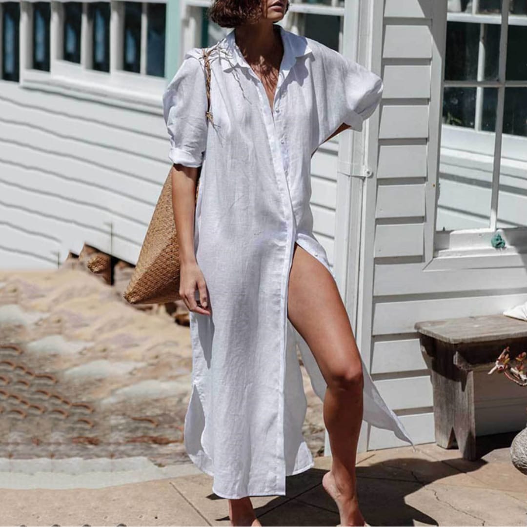 Lightweight white cotton beach cover-up shirt with 3/4 sleeves, perfect for breezy summer days.