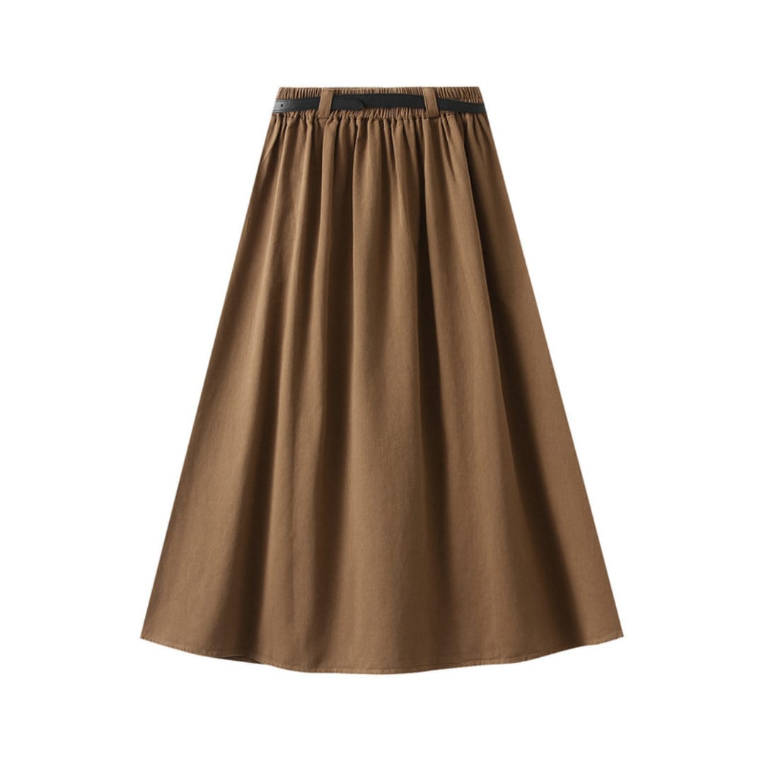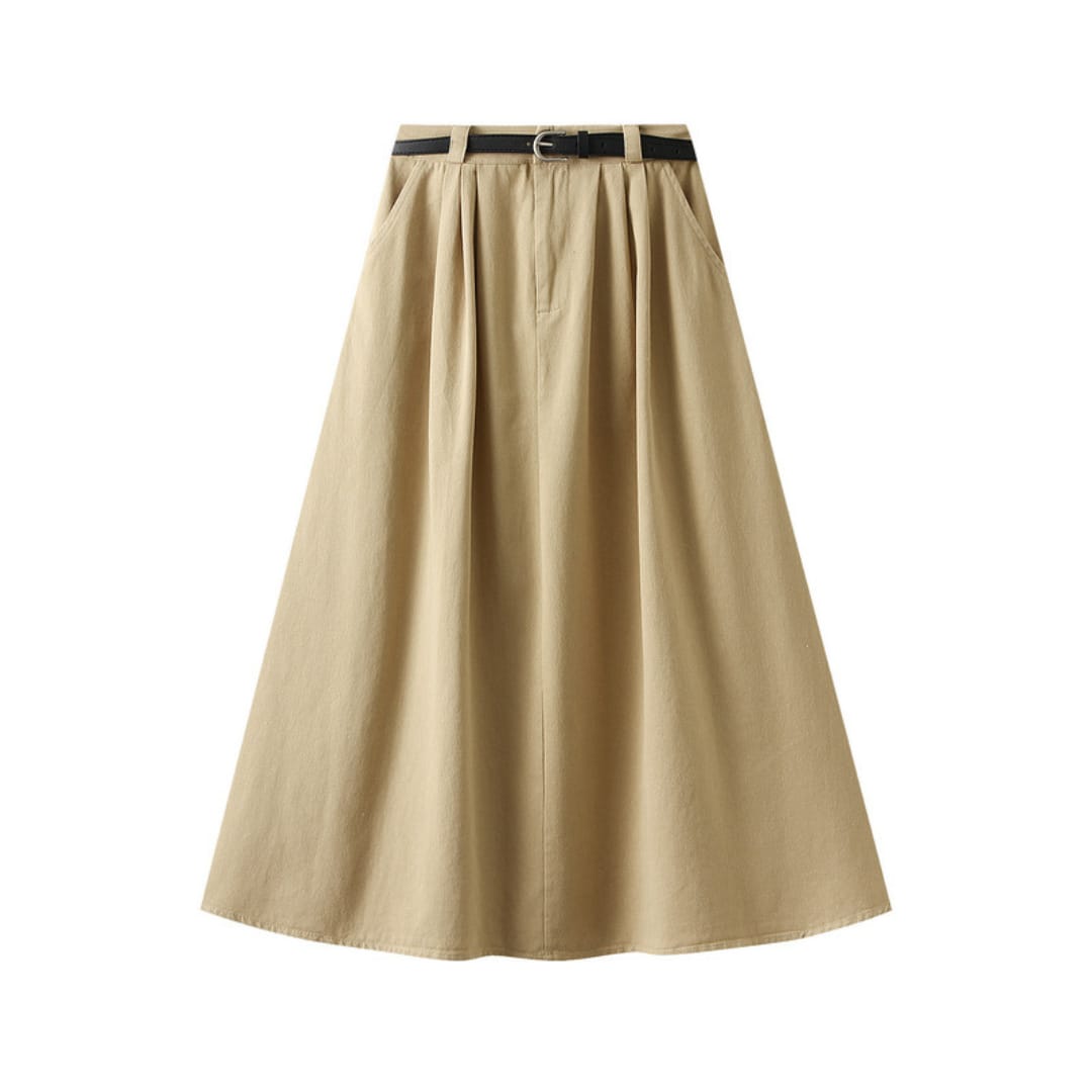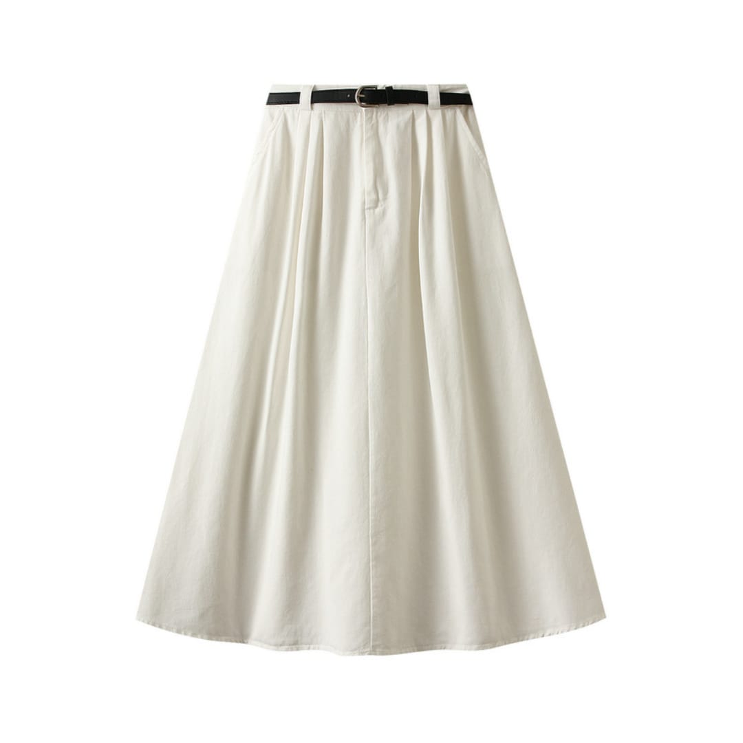 Breathable cotton midi skirt featuring a waist-defining belt for casual comfort and everyday style.