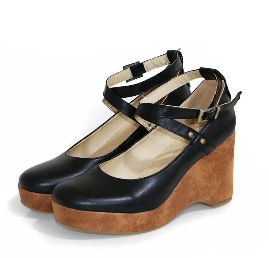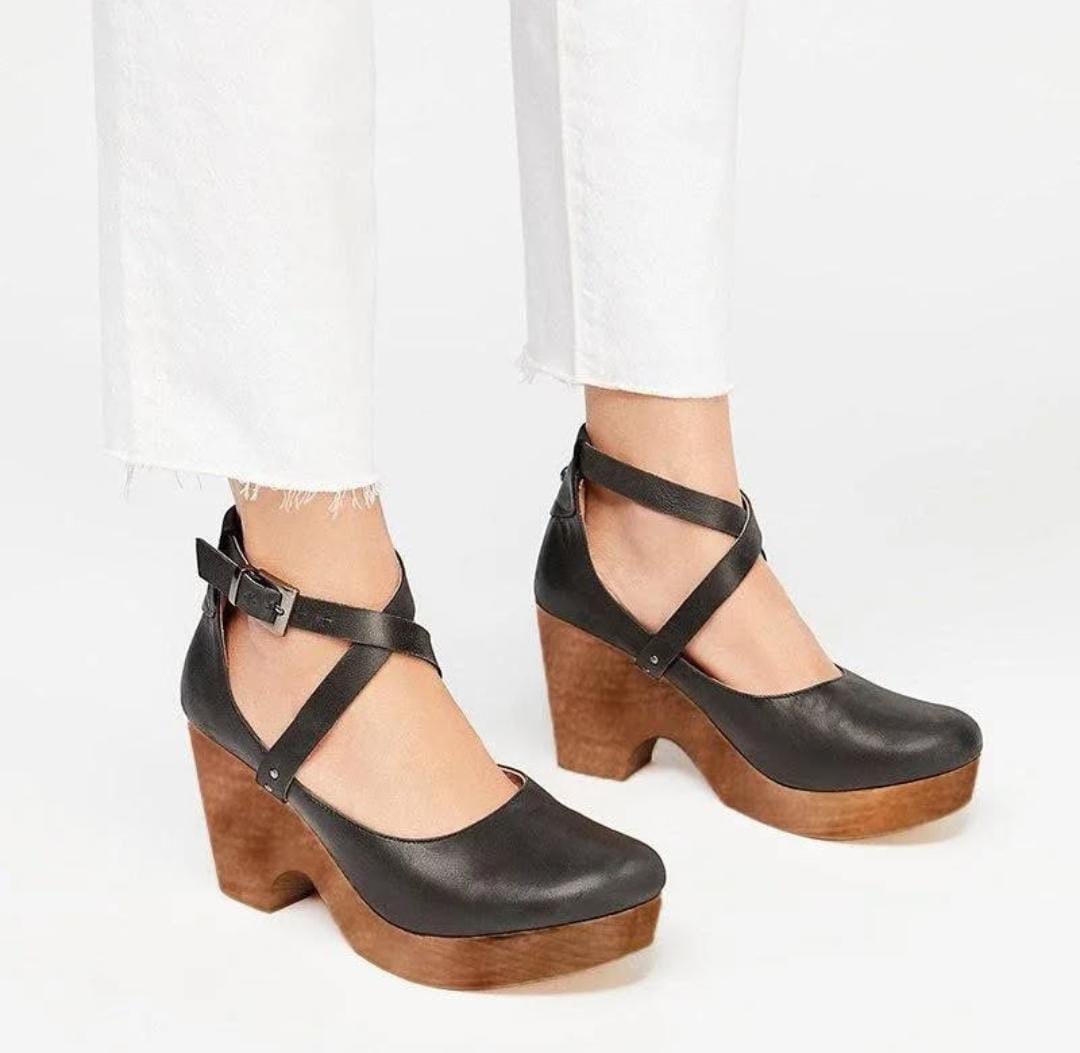 Criss-Cross Ankle Strap Round Toe Chunky Pumps