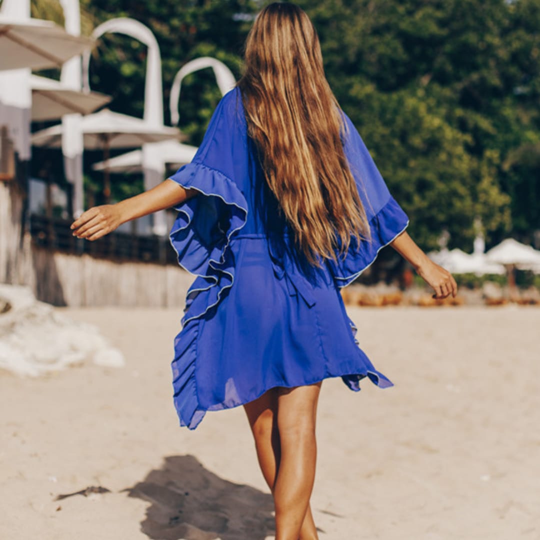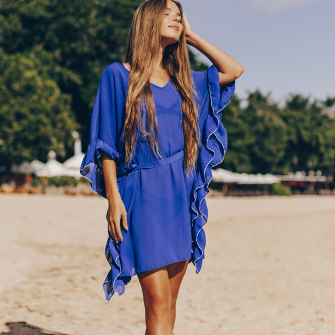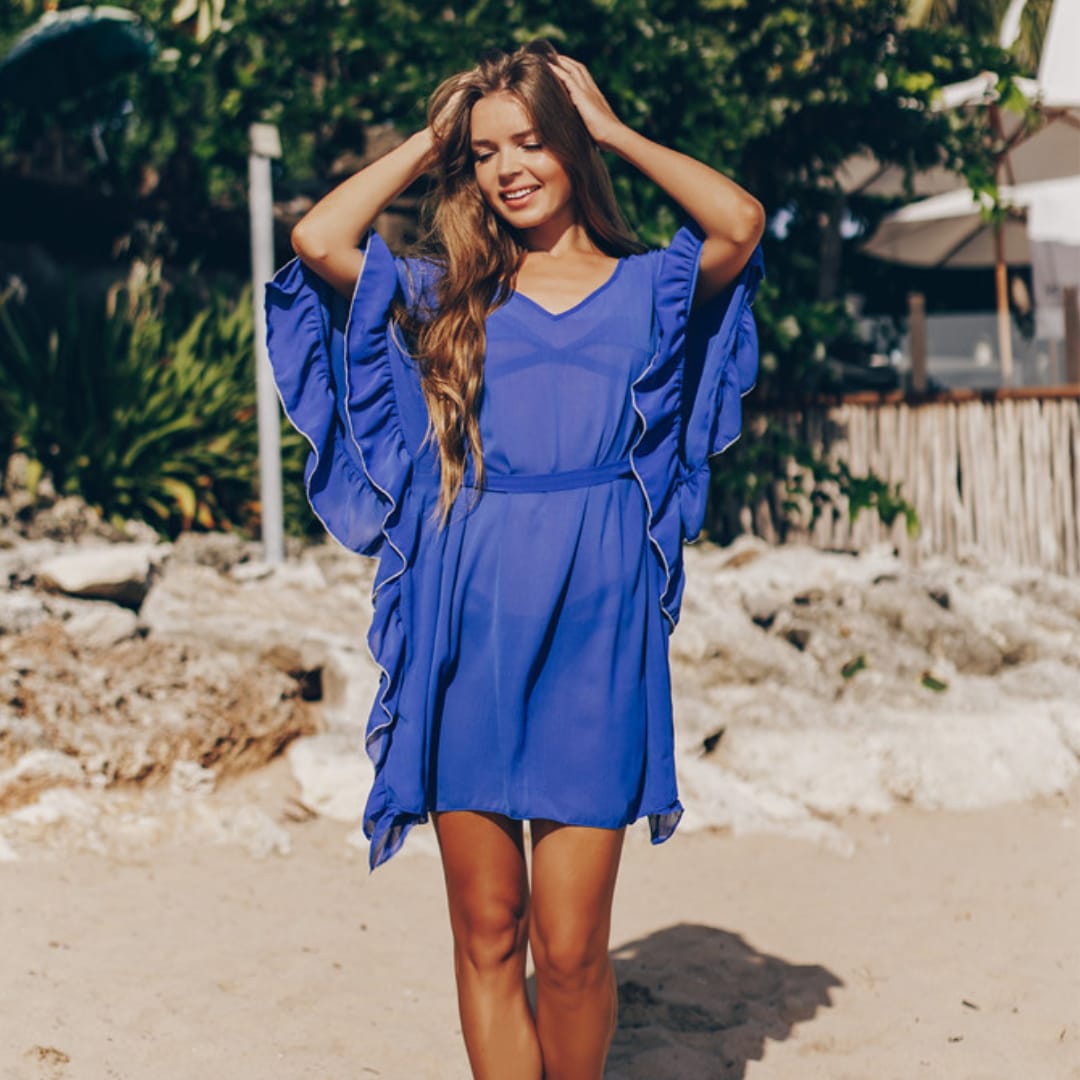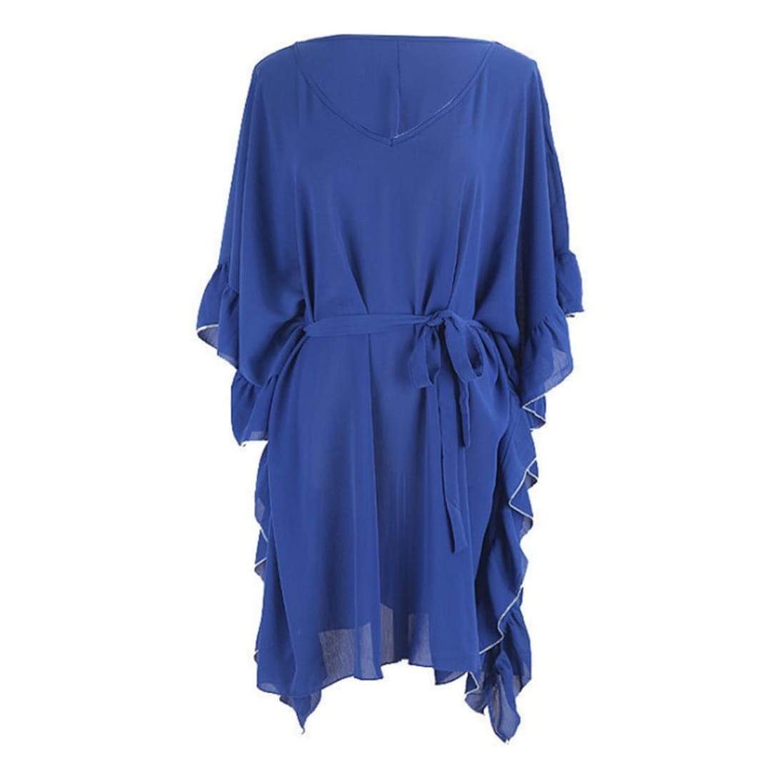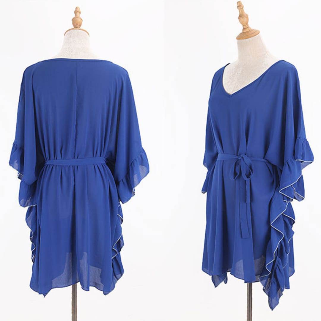 Flowy dark blue chiffon beach dress with a wrinkled texture, loose fit, and adjustable belt for a chic summer look.