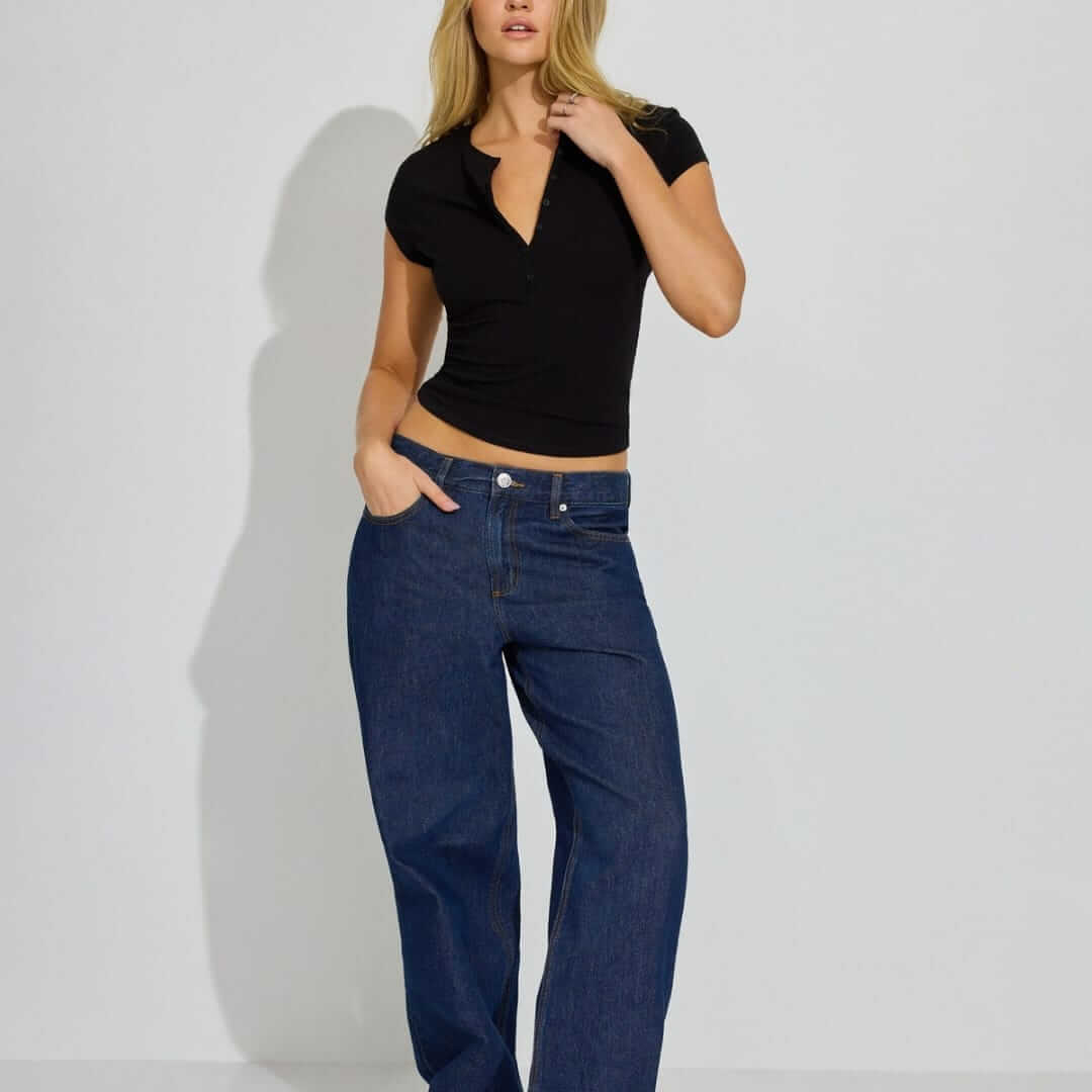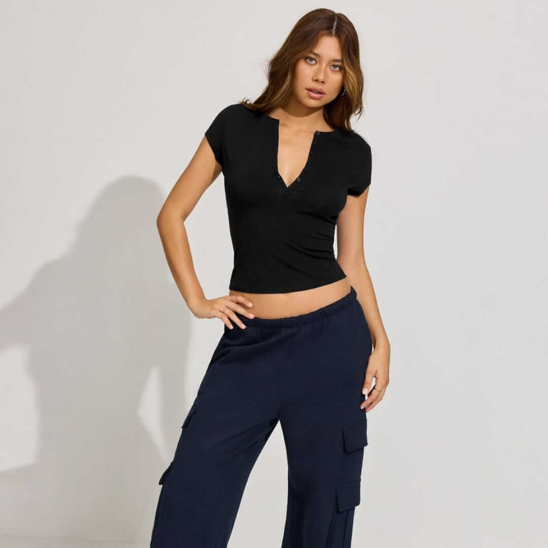 Womens deep V button-up T-shirt featuring a flattering neckline and stylish fitperfect for casual wear, layering, or creating effortlessly chic everyday outfits.