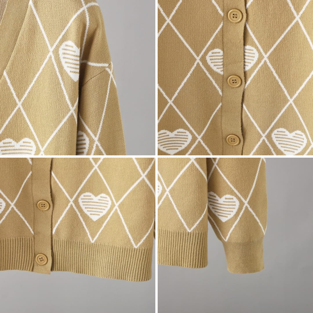 Stay cute and cozy with our Diamond Pattern Cardigan featuring charming heart shapes, perfect for playful yet chic looks.