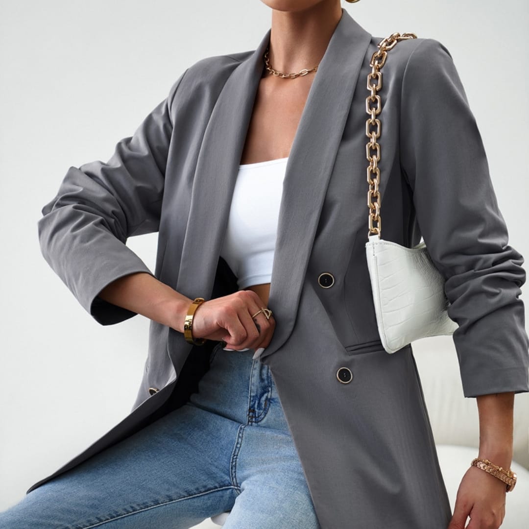 Elevate your wardrobe with this Womens Double-Breast Multi-Wear Suit Jacket, offering versatile styling options, a chic tailored fit, and timeless sophistication.