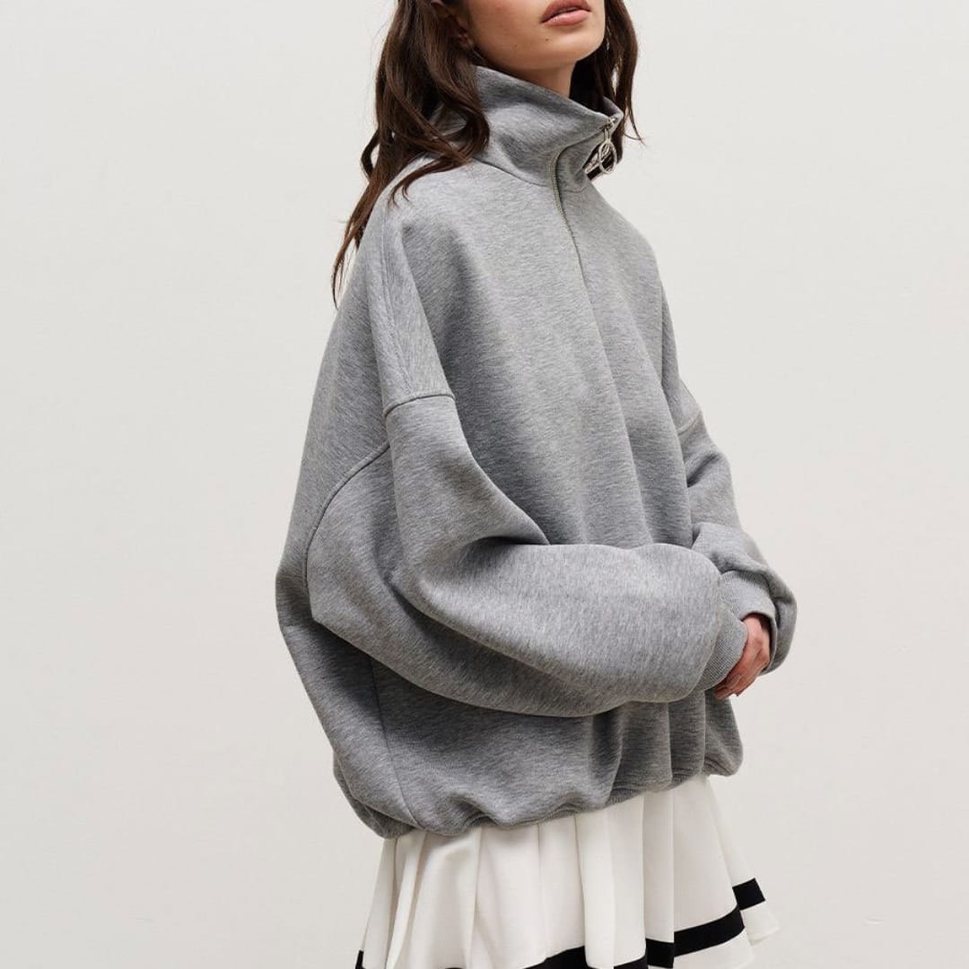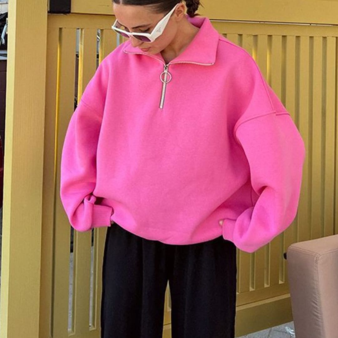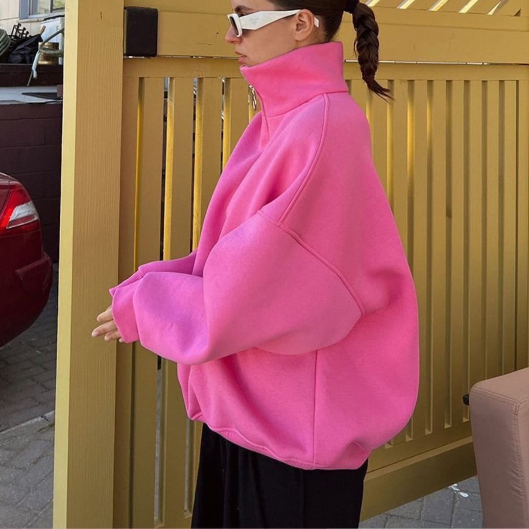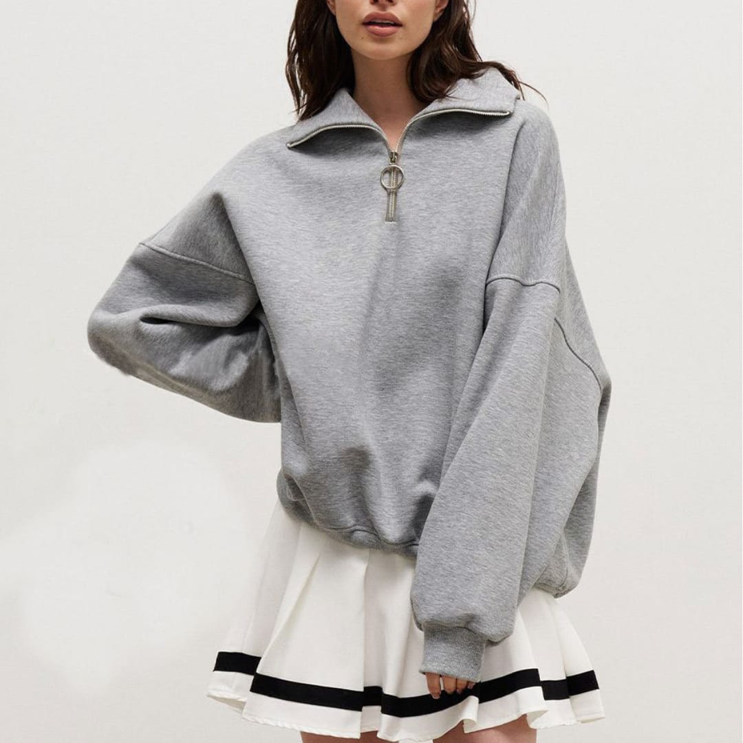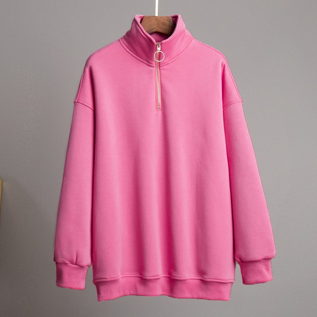 The Womens Half Zip Collar Fleeced Oversized Dropped Shoulders Sweatshirt brings ultimate comfort and laid-back elegance to your fall and winter wardrobe. Crafted from premium cotton-blend fabric with a soft fleeced interior, it provides lasting warmth and a luxuriously cozy feel. The half-zip collar allows for adjustable styling, while the oversized silhouette and dropped shoulders give it a relaxed, modern look. Perfect for layering over leggings, jeans, or joggers, this sweatshirt transitions effortlessly from lounging at home to casual outings. Comfortable, versatile, and trendy its your must-have piece for effortless cool-weather fashion.