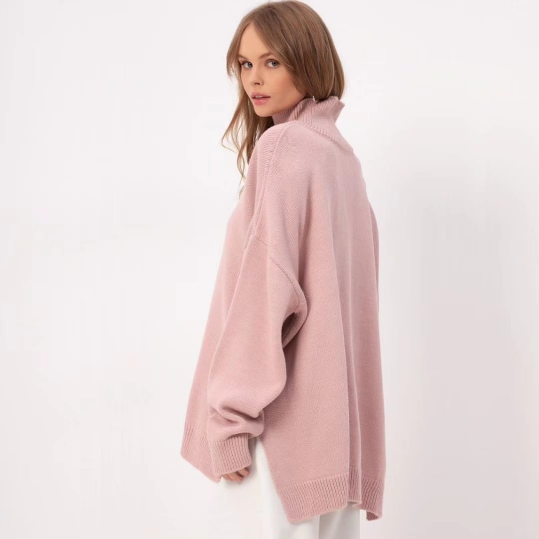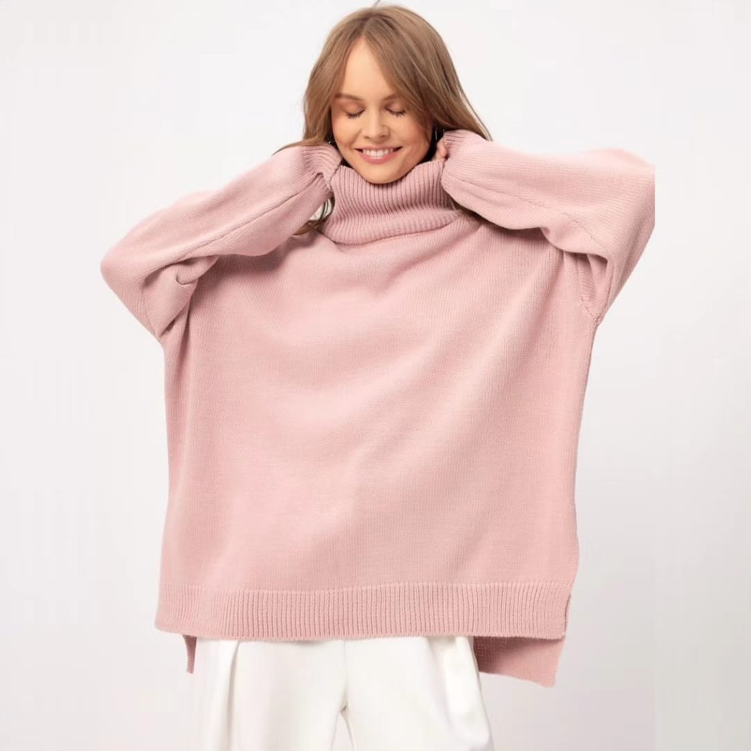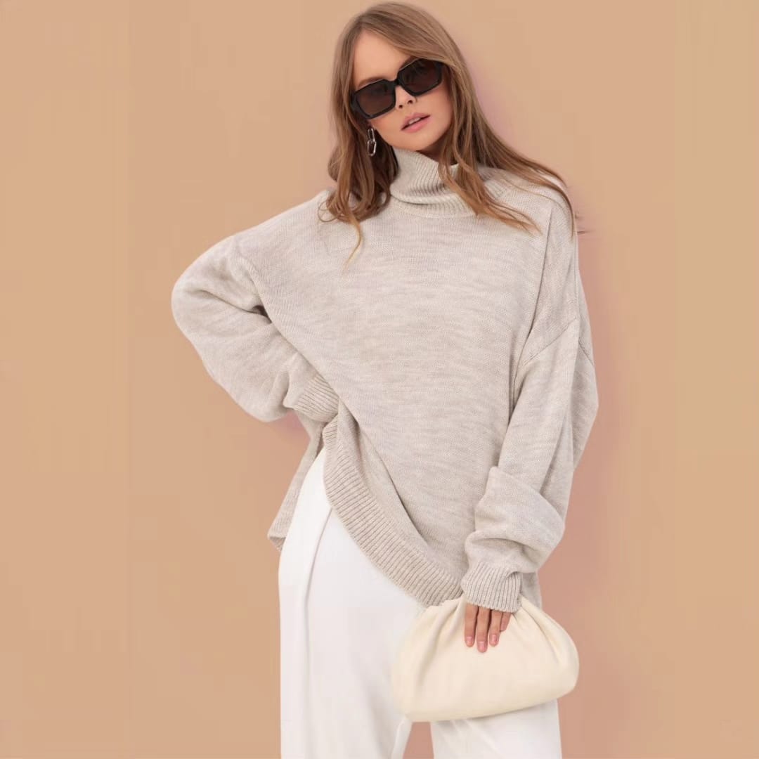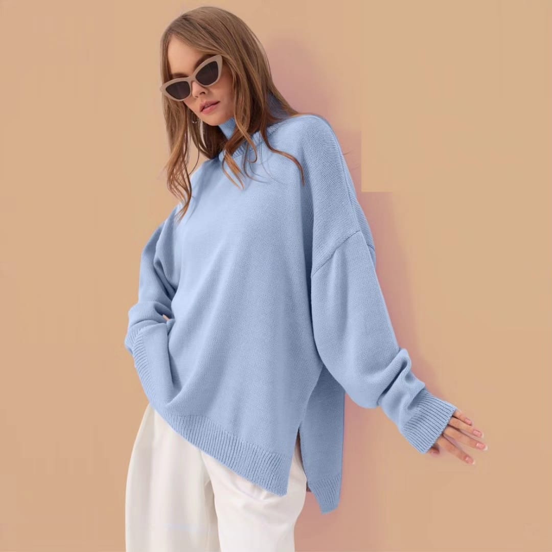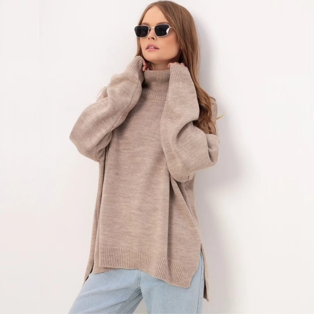 Chic and cozy, this high collar knitted top with side slit offers warmth and a modern edge.