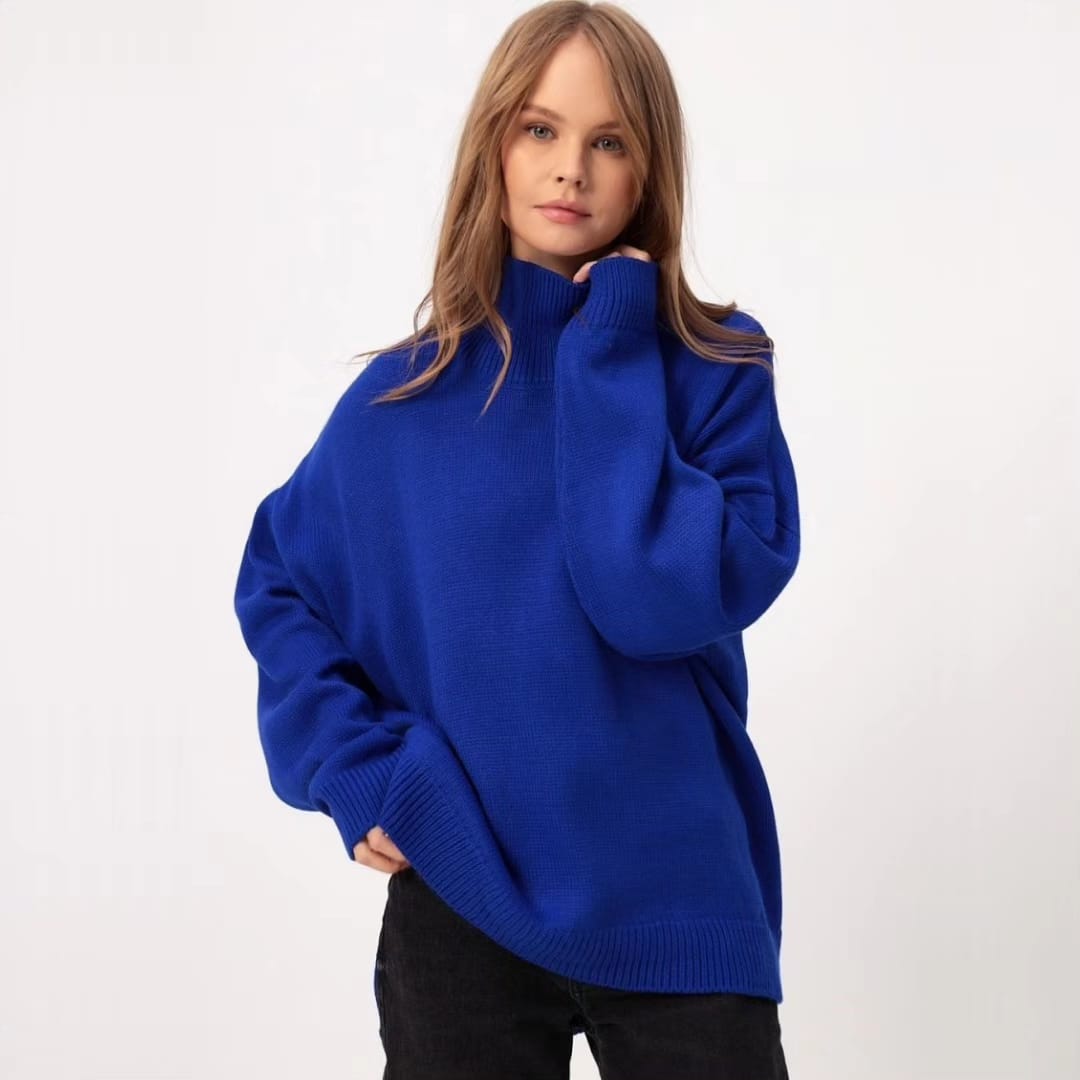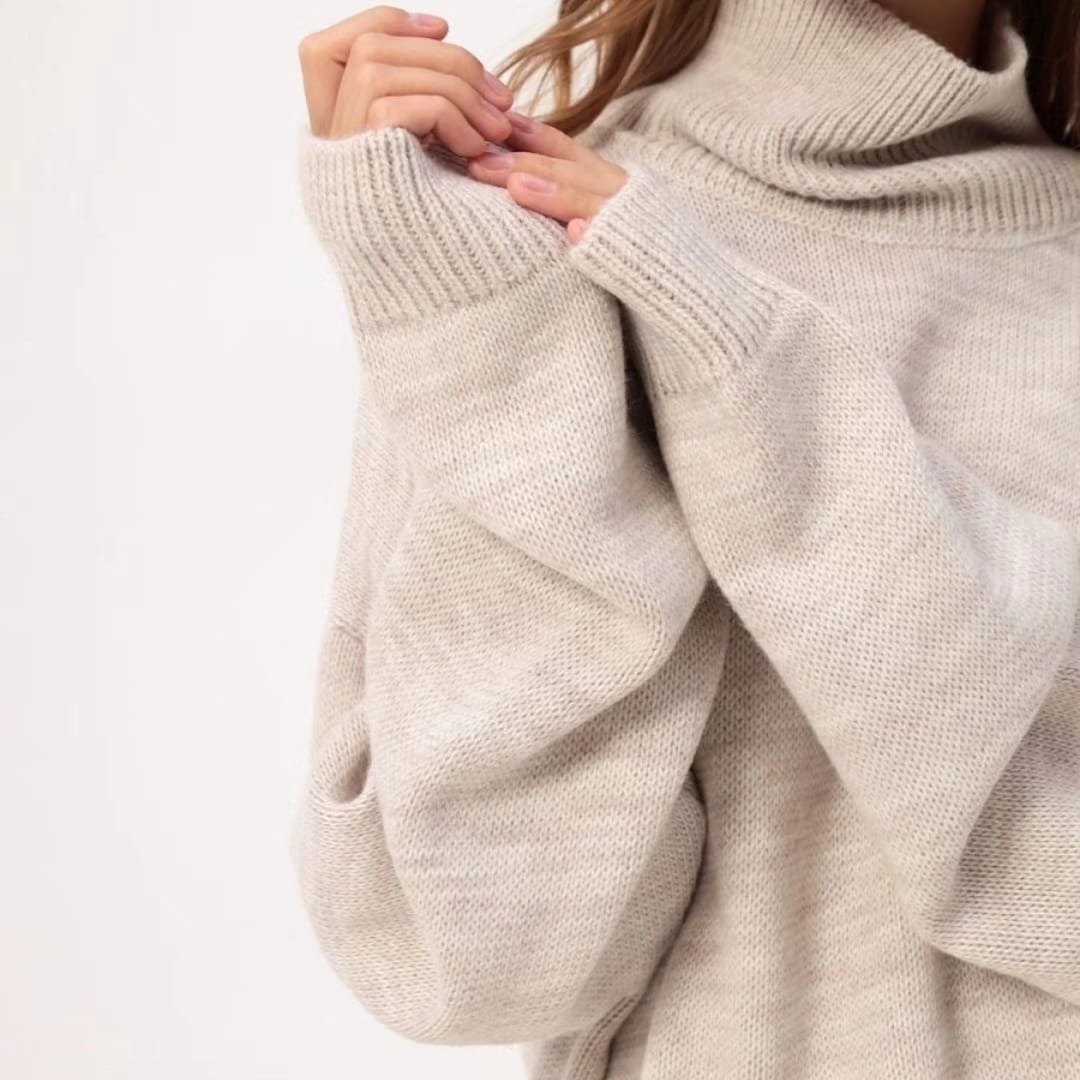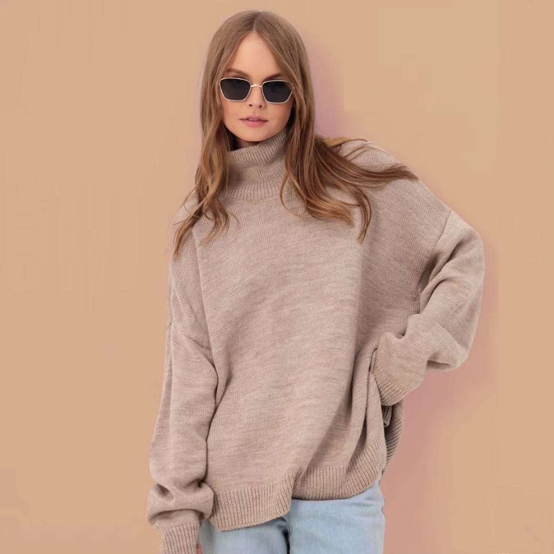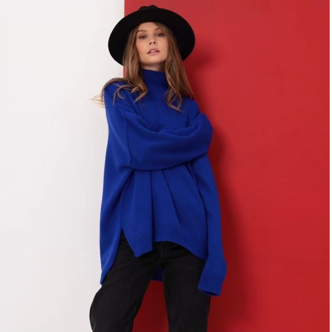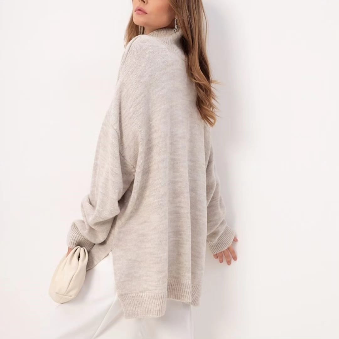 Chic and cozy, this high collar knitted top with side slit offers warmth and a modern edge.