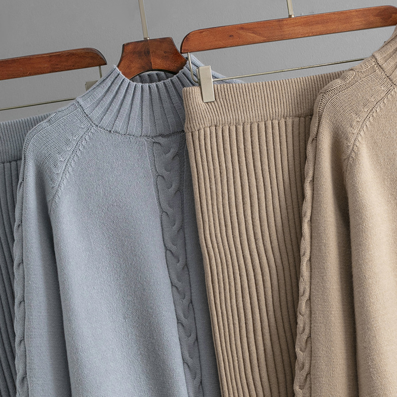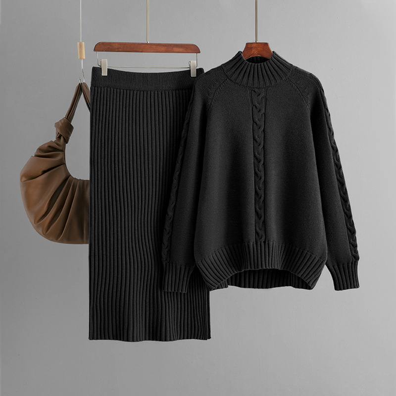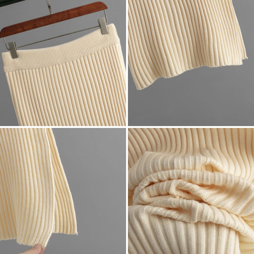 Cozy high collar sweater paired with a ribbed knit skirt for a sleek and elegant look.