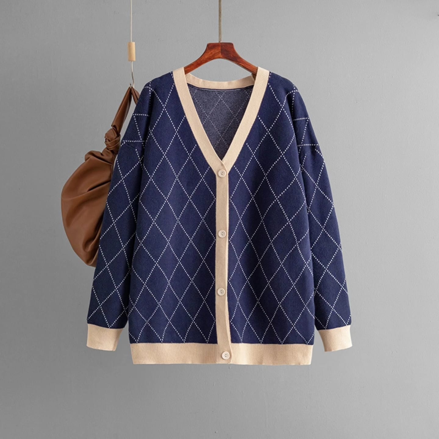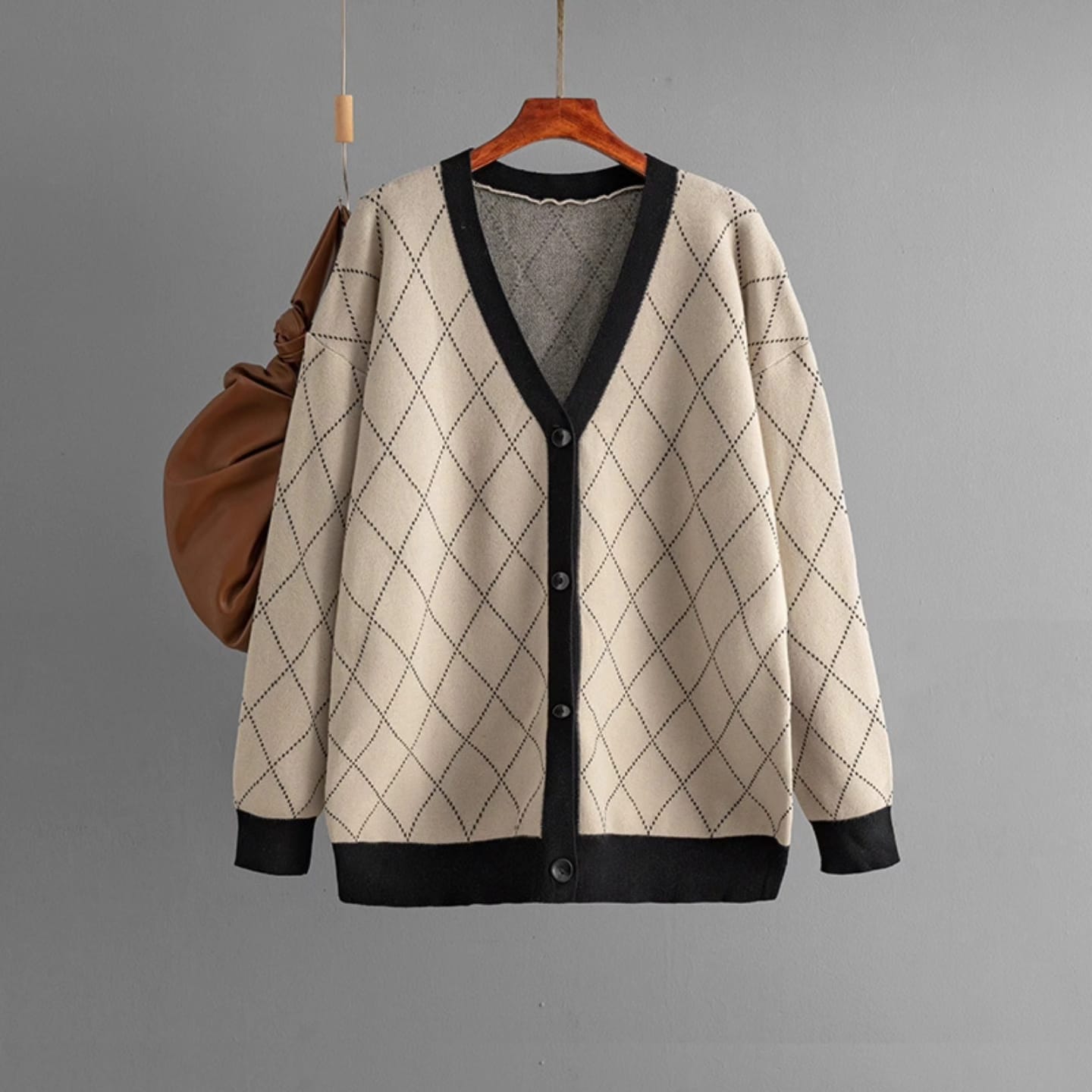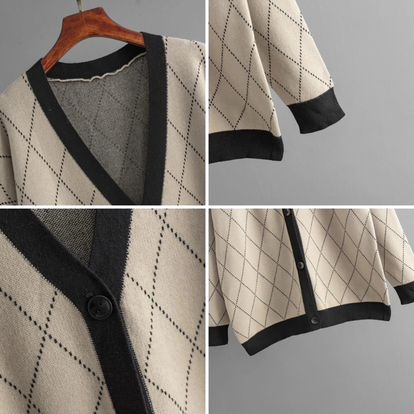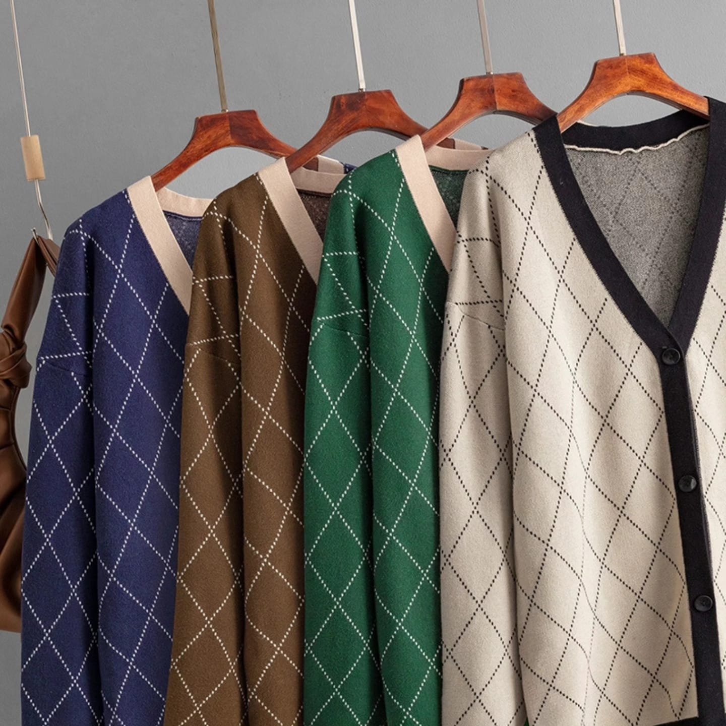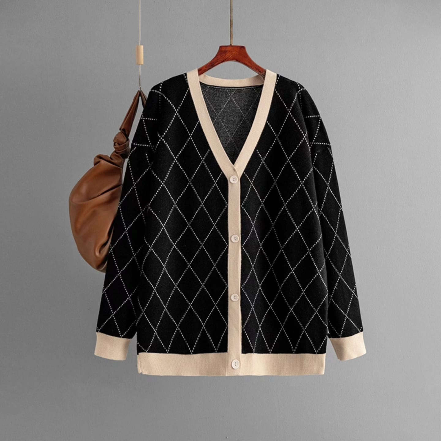 Add a pop of style to your wardrobe with our Knitted Plaid Color Contrast Cardigan, perfect for chic layering.