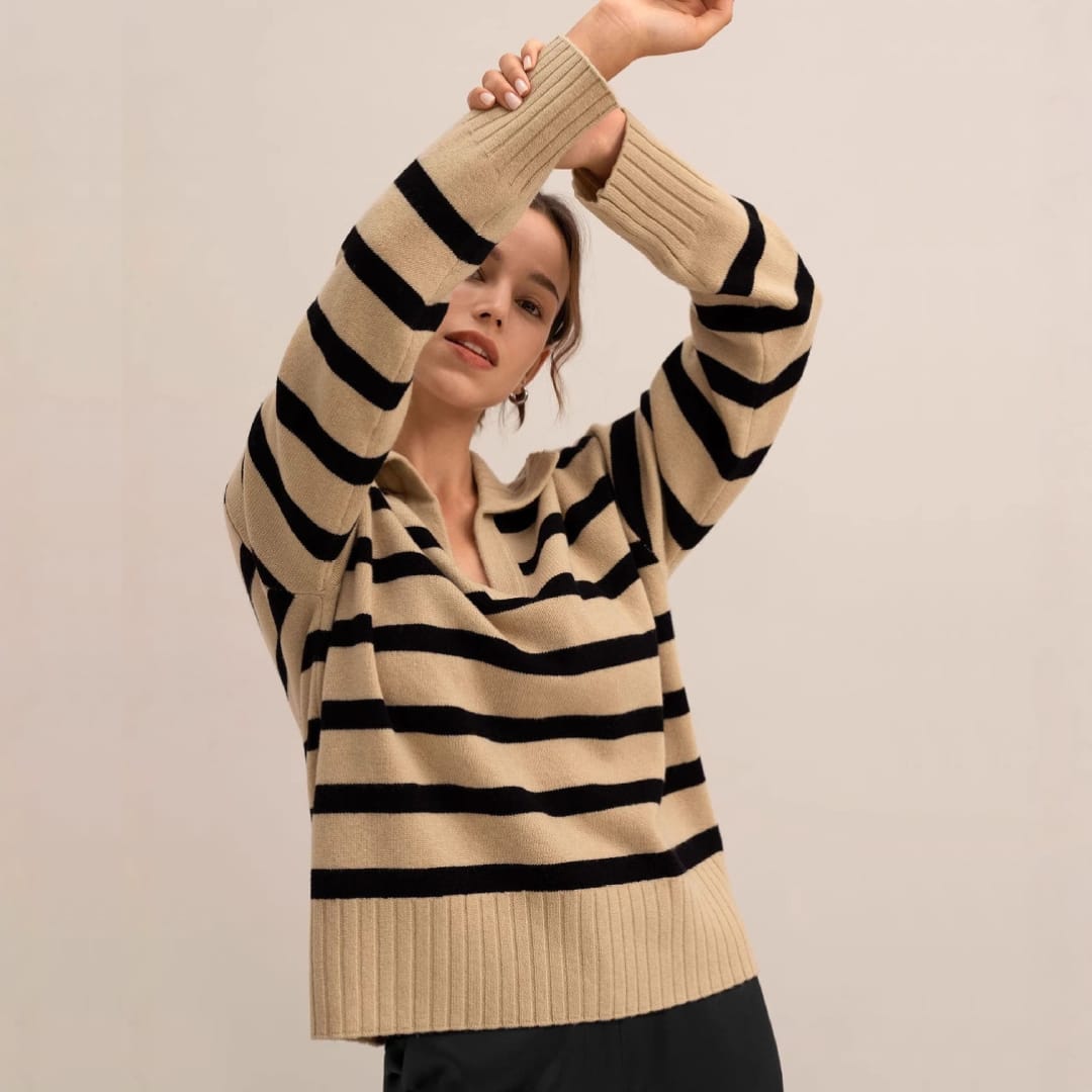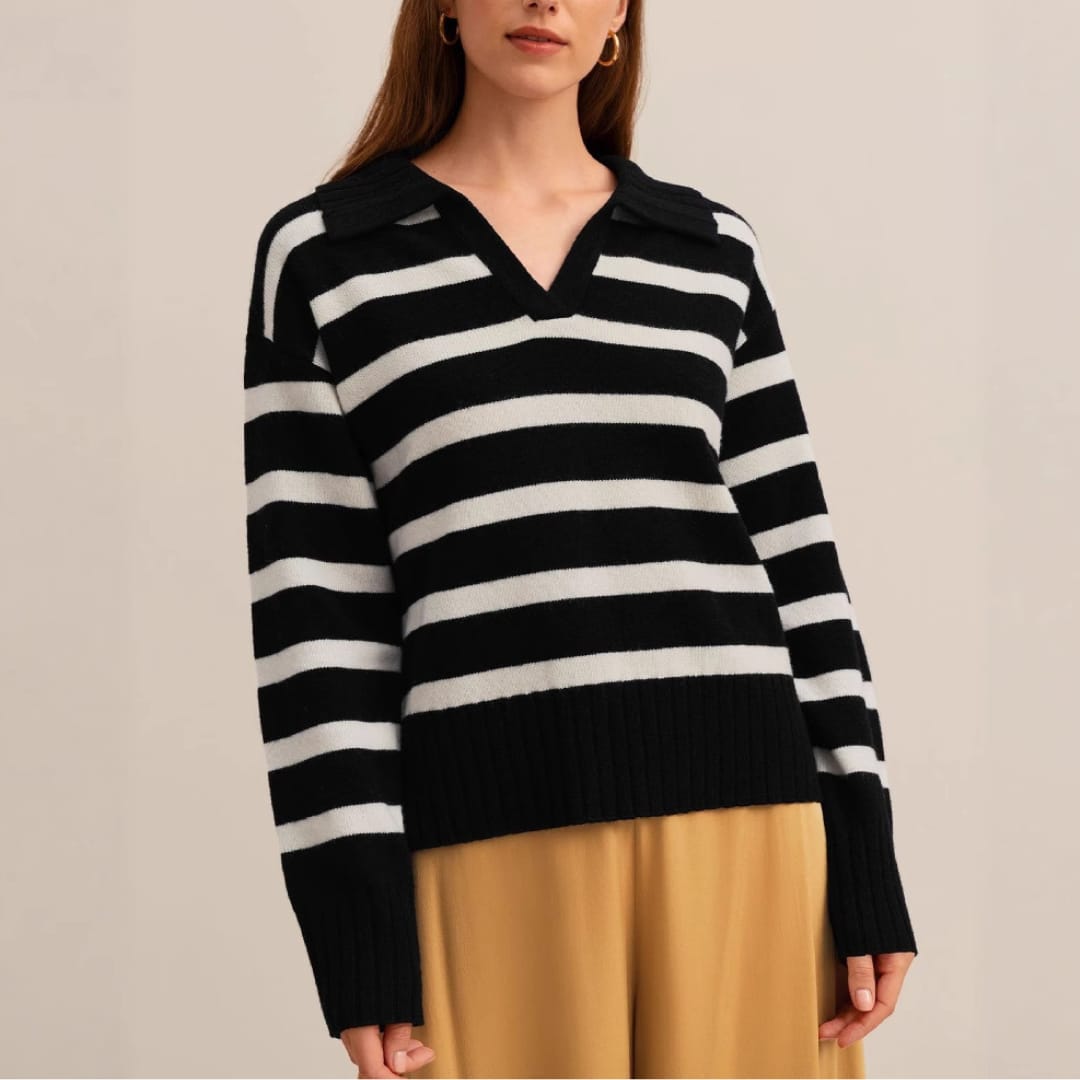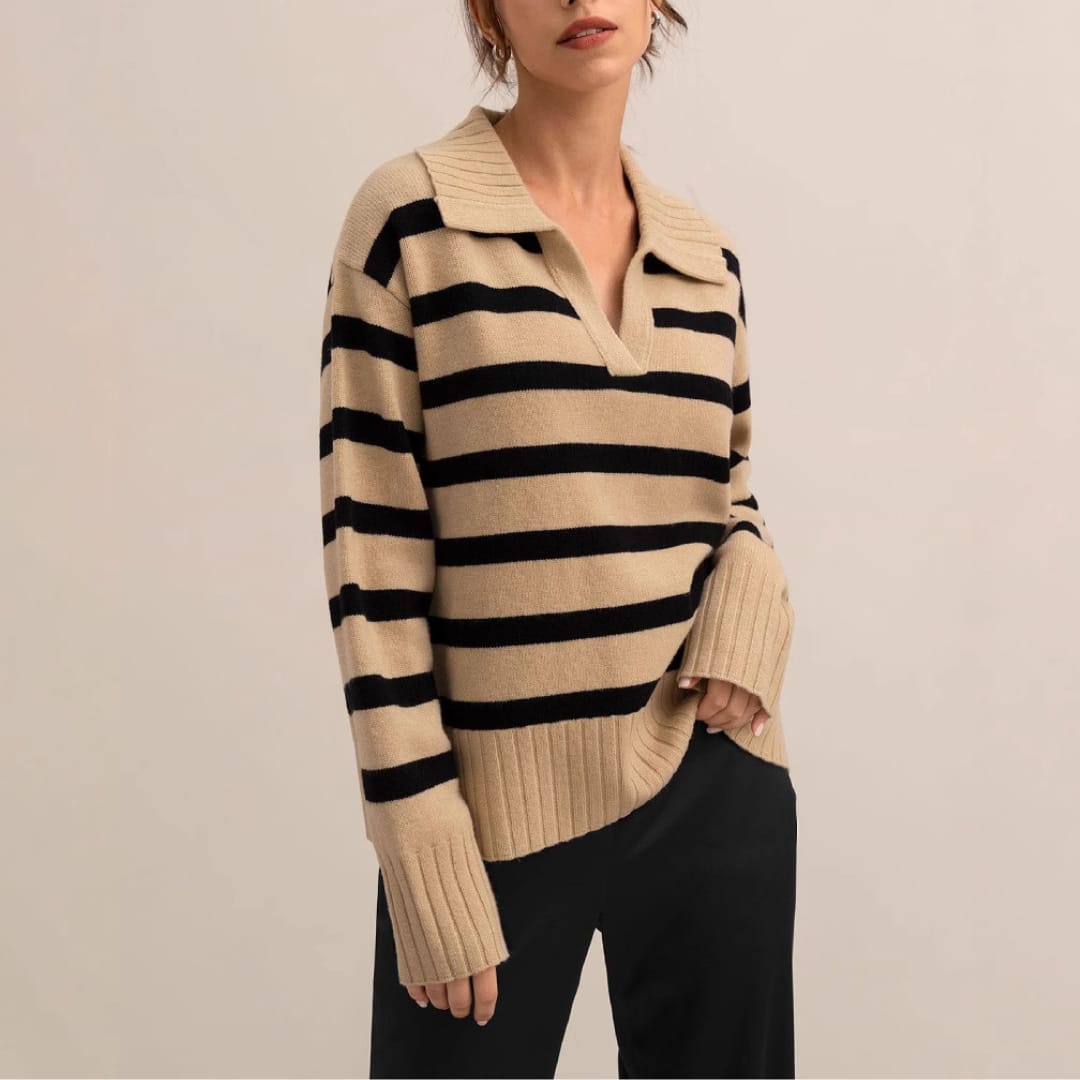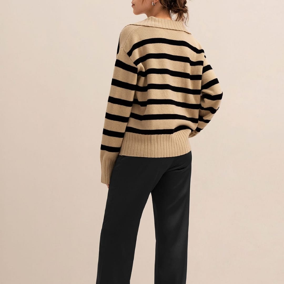 Add a touch of modern sophistication to your wardrobe with the Autumn Winter Women’s Knitted Polo Collar Striped Sweater — a cozy yet stylish essential for effortless seasonal dressing.