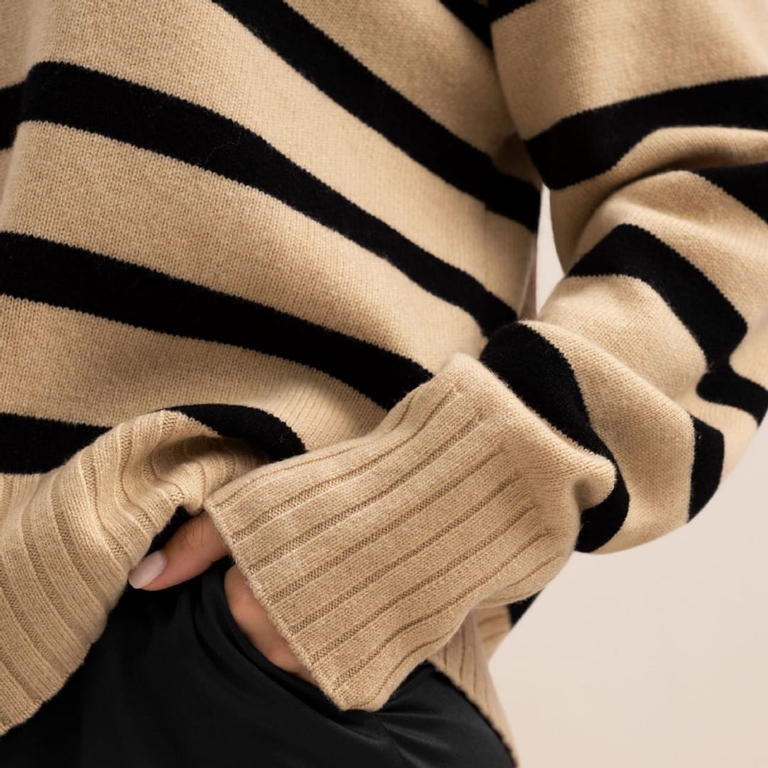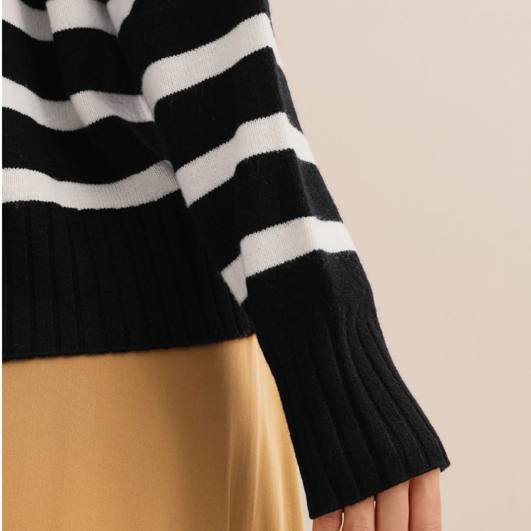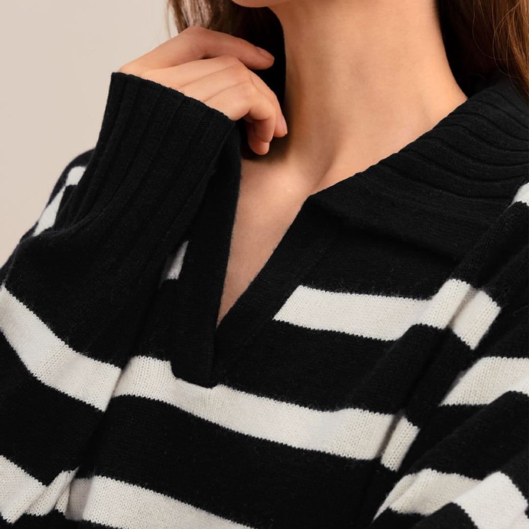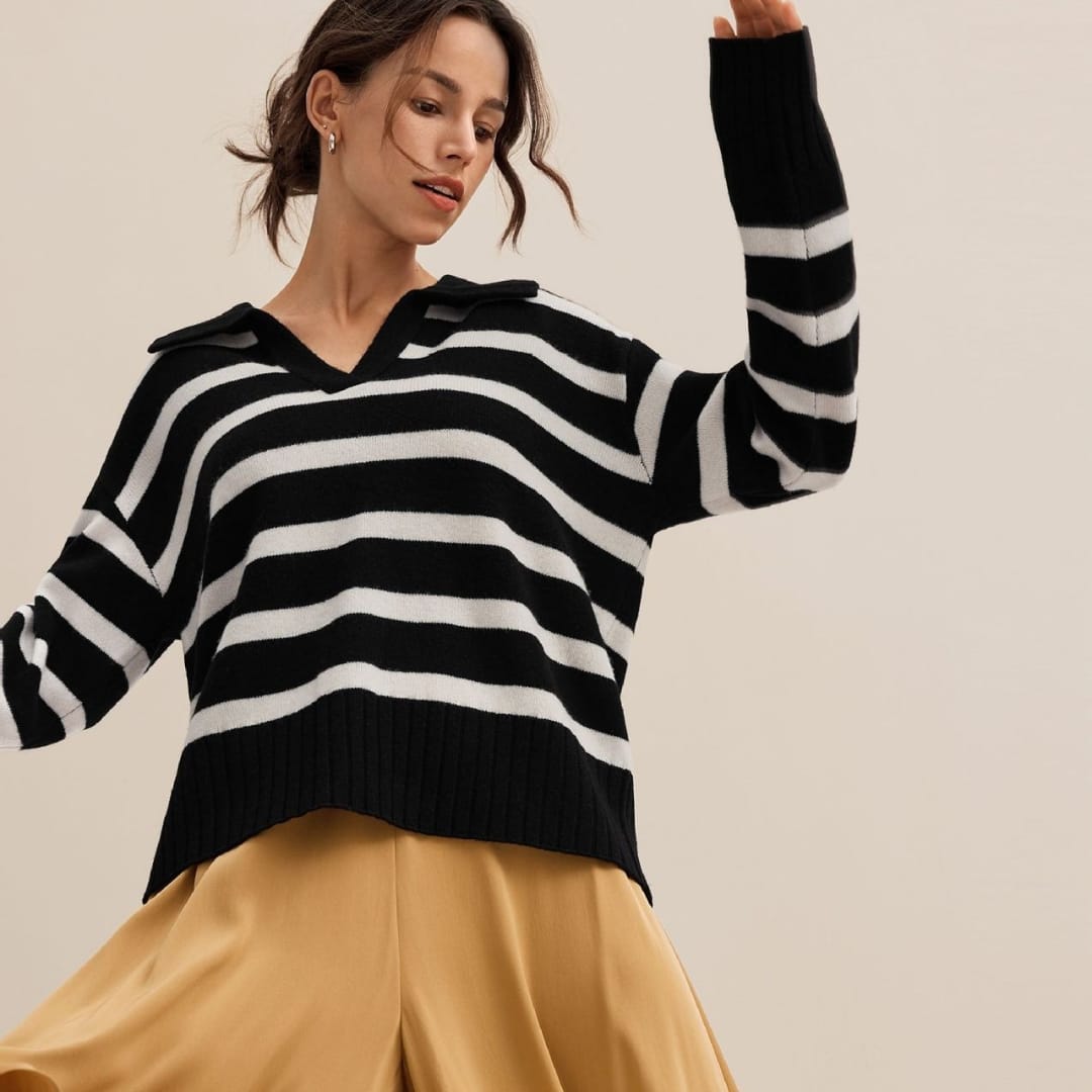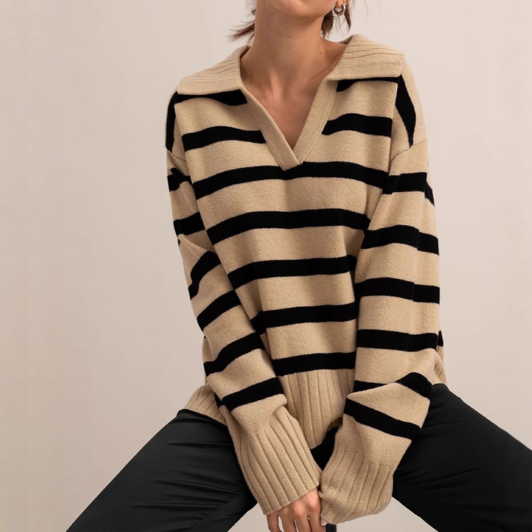 Add a touch of modern sophistication to your wardrobe with the Autumn Winter Women’s Knitted Polo Collar Striped Sweater — a cozy yet stylish essential for effortless seasonal dressing.