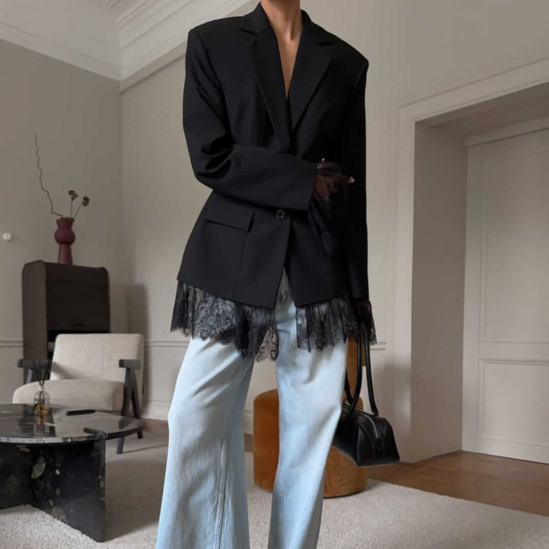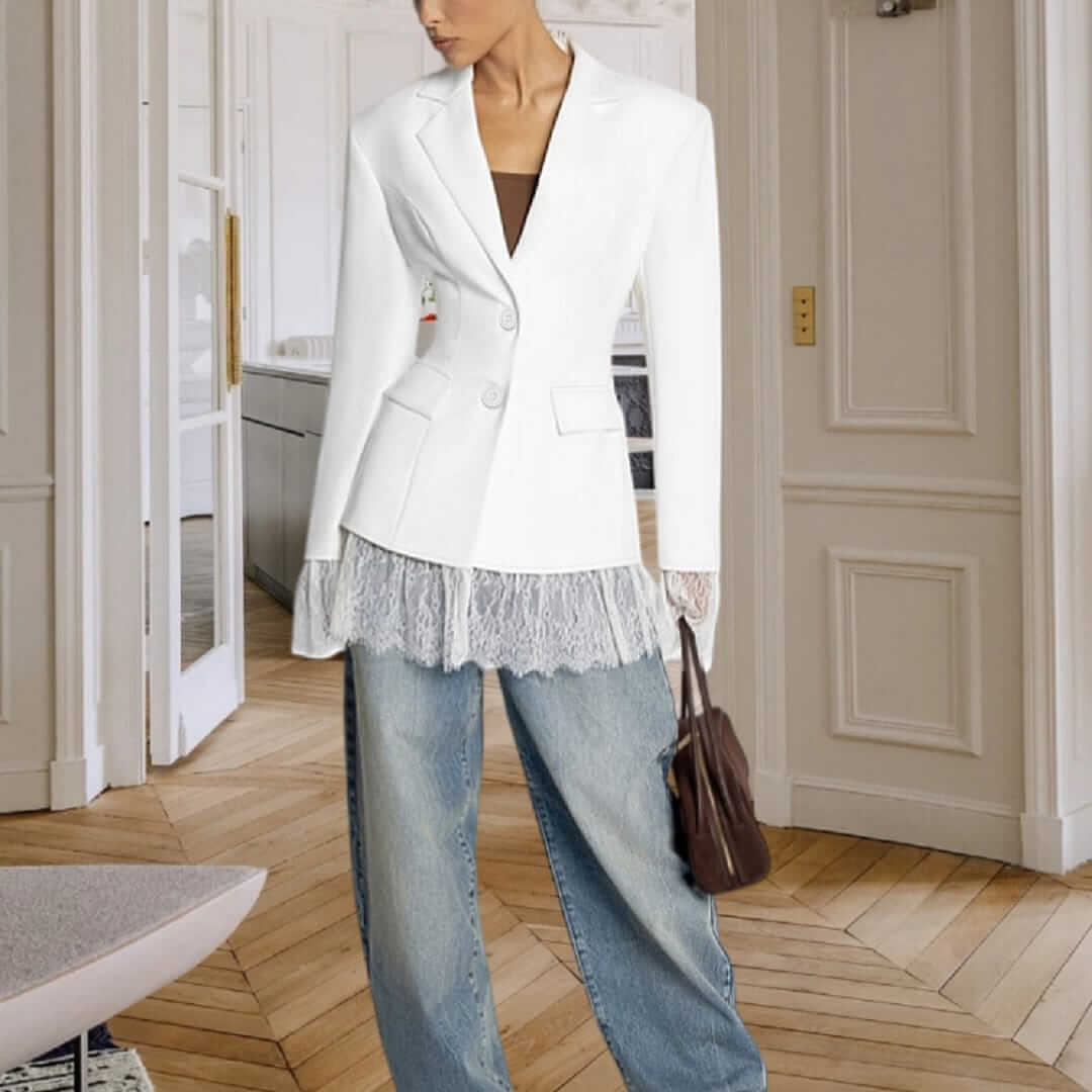 Sophisticated womens laced tailored blazer jacket combining structured elegance with a modern, feminine touch.