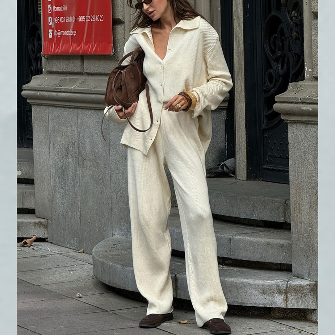 Stay cozy and stylish this season with the Fall Winter Knitted Set featuring a lapel collar long-sleeved ribbed sweater and casual wide loose fit pants perfect for effortless chic comfort.