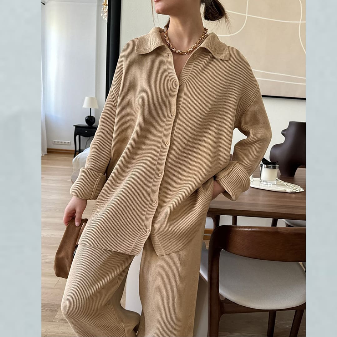 Embrace warmth and elegance with this Fall Winter Knitted Set, designed for modern women who value both style and comfort. The set includes a long-sleeved ribbed sweater with a sophisticated lapel collar, providing a flattering and cozy fit. Complemented by casual wide-leg loose fit pants, this ensemble ensures freedom of movement and relaxed sophistication. Made from soft, high-quality knit fabric, it offers warmth without sacrificing style, making it ideal for casual outings, work, or lounge wear. Versatile and timeless, this knitted set is a must-have addition to your seasonal wardrobe for effortless chic appeal.