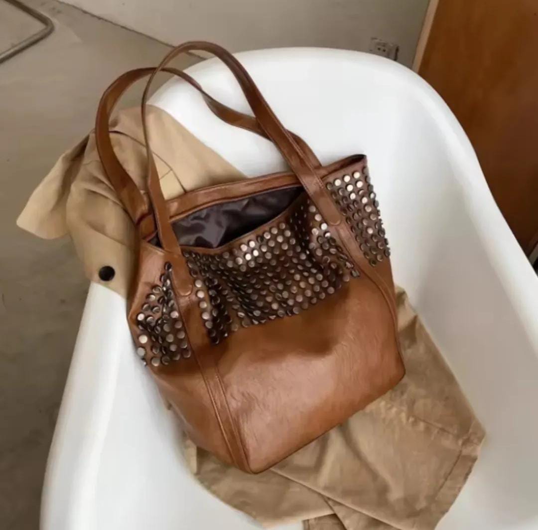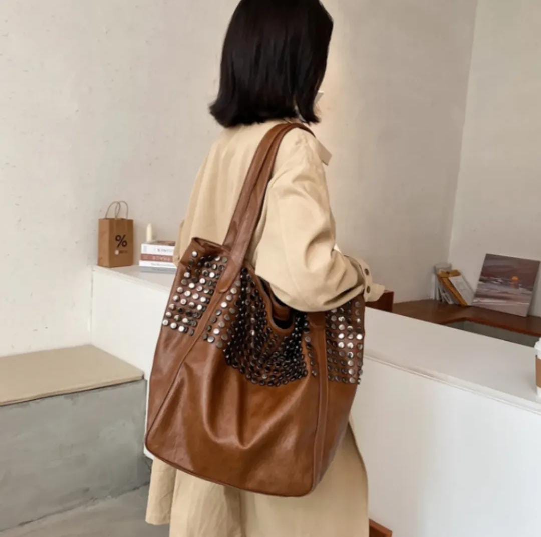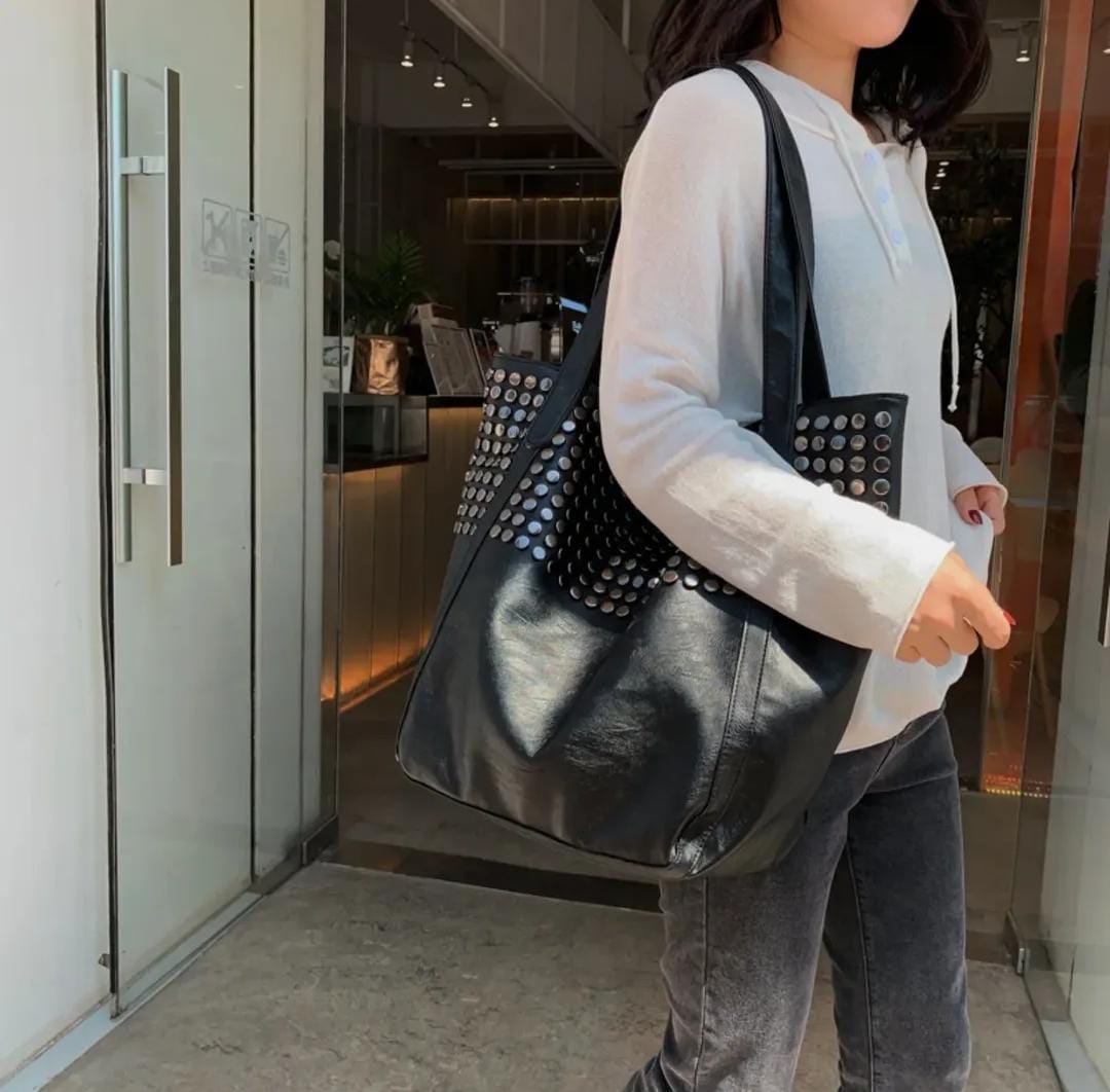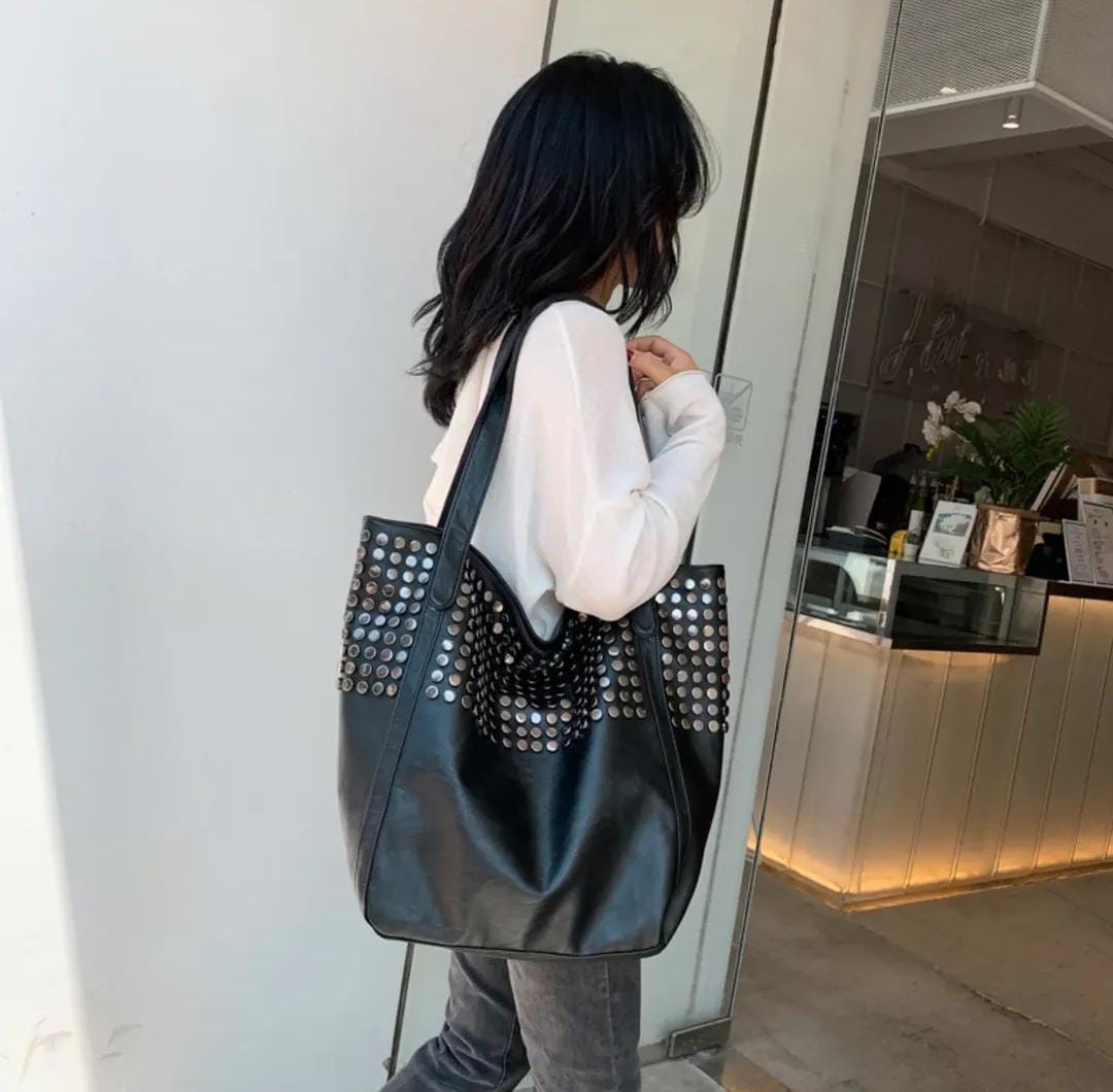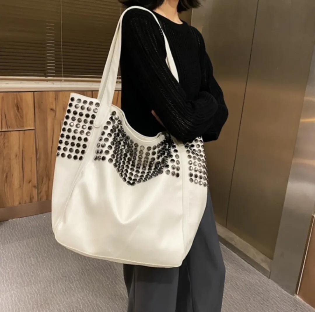 Carry your essentials in style with this Womens Large Shoulder Tote featuring bold silver studs, spacious design, and durable construction for everyday use.