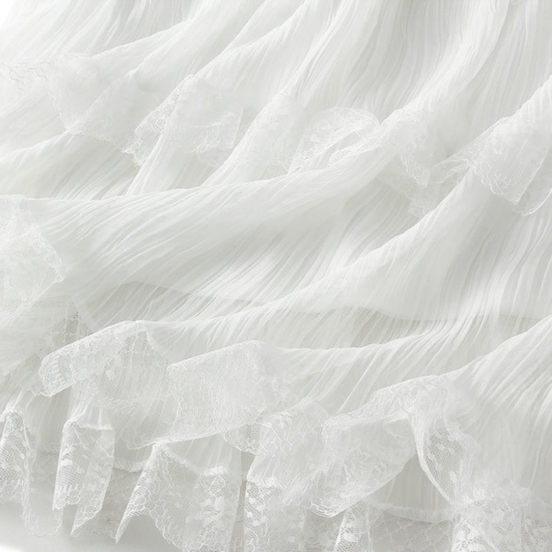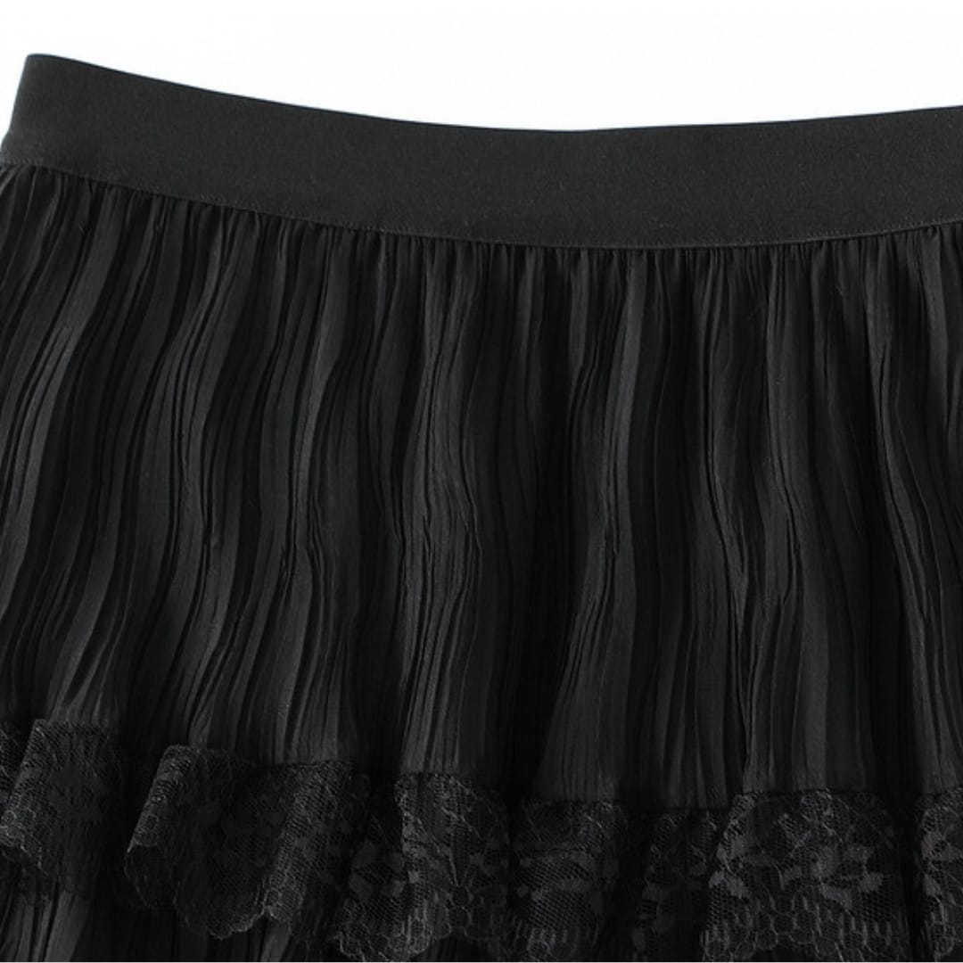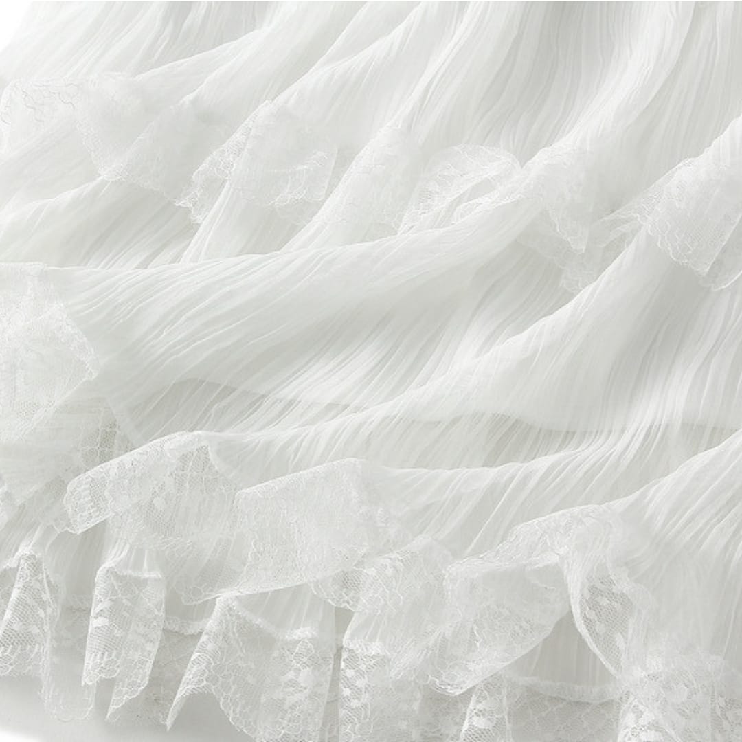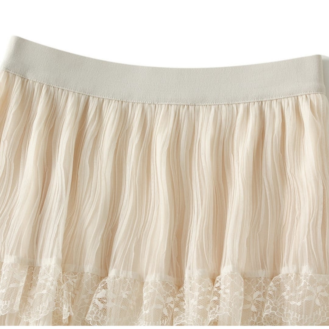 Delicate and dreamy, this layered pleated chiffon skirt with lace accents adds romance and elegance to any outfitperfect for special occasions or everyday chic.