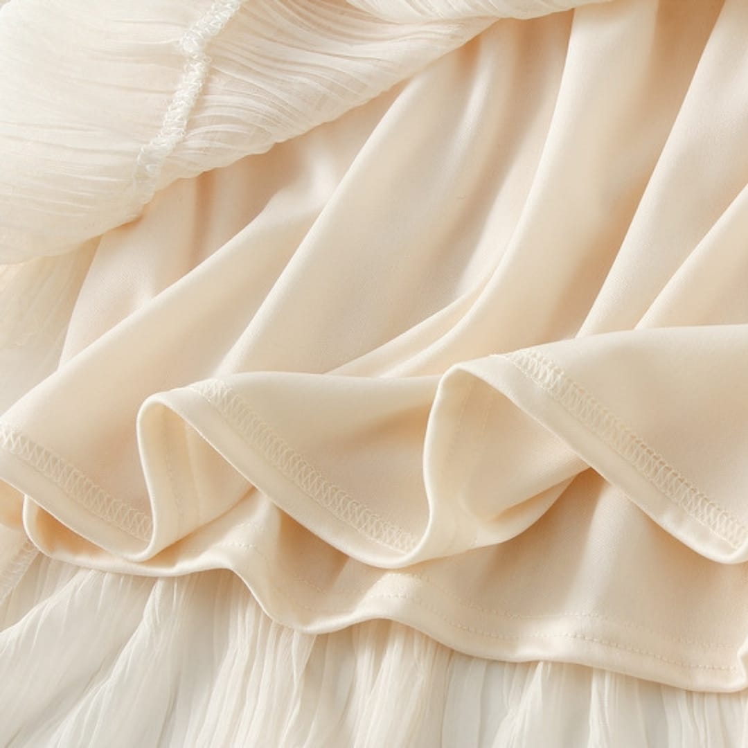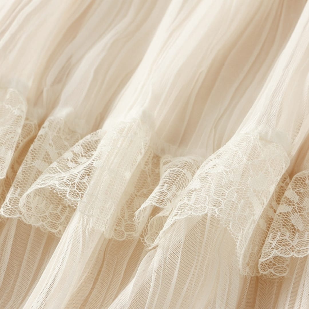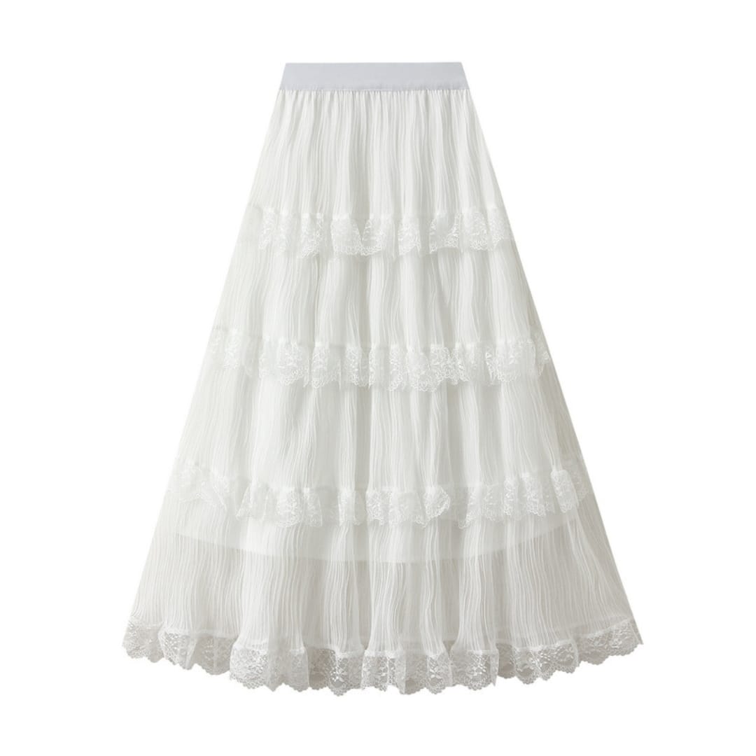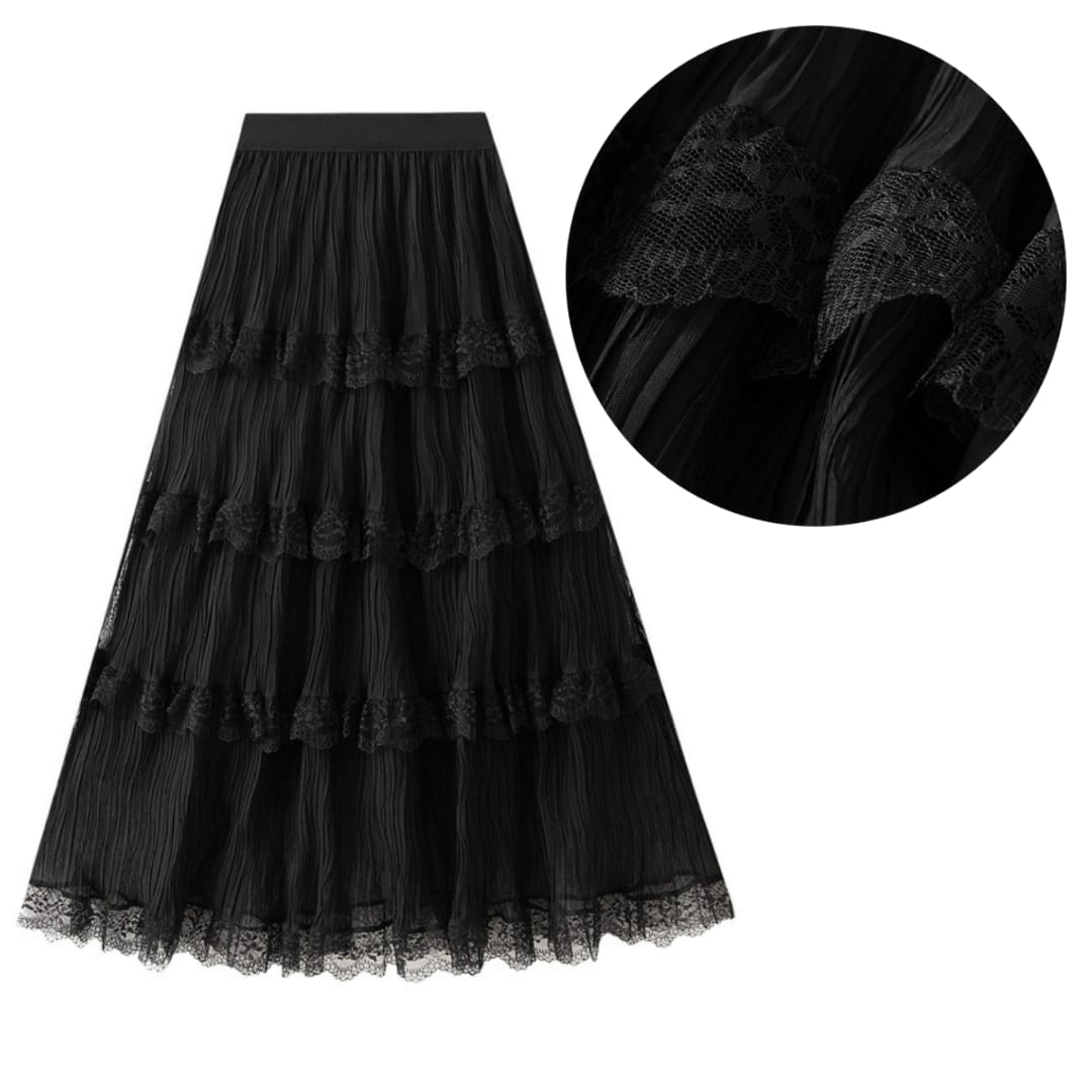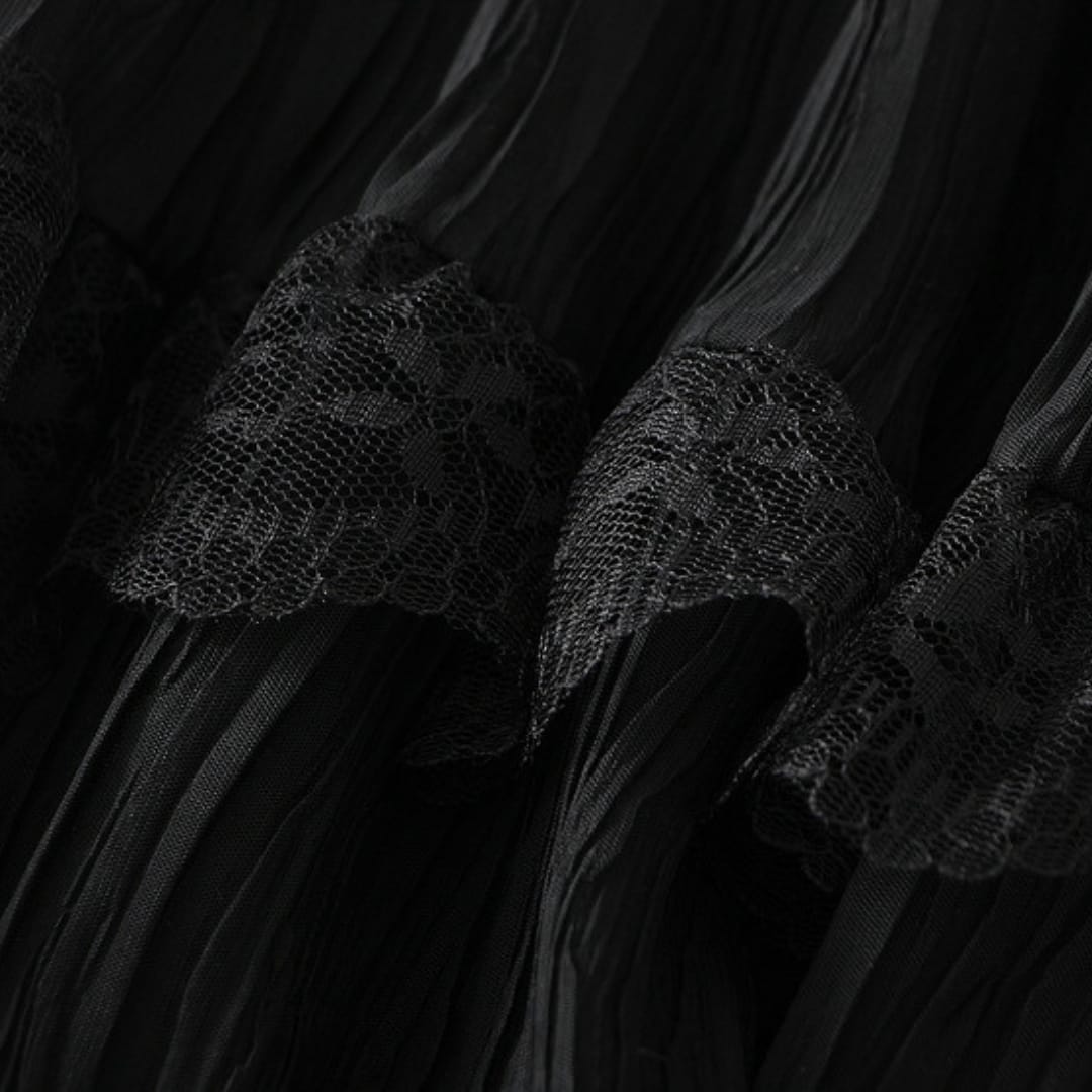 Delicate and dreamy, this layered pleated chiffon skirt with lace accents adds romance and elegance to any outfitperfect for special occasions or everyday chic.