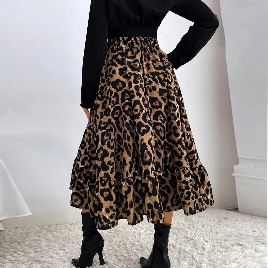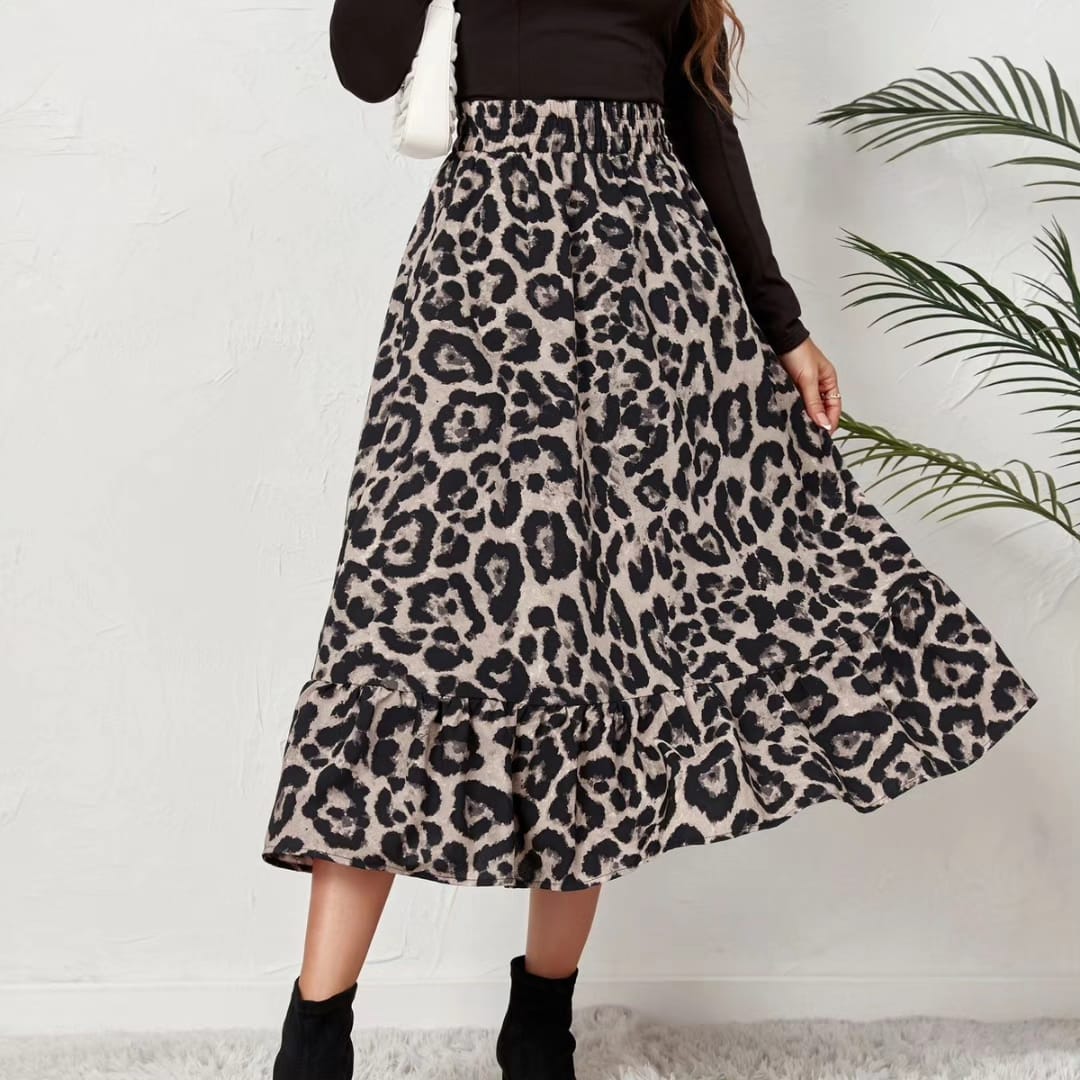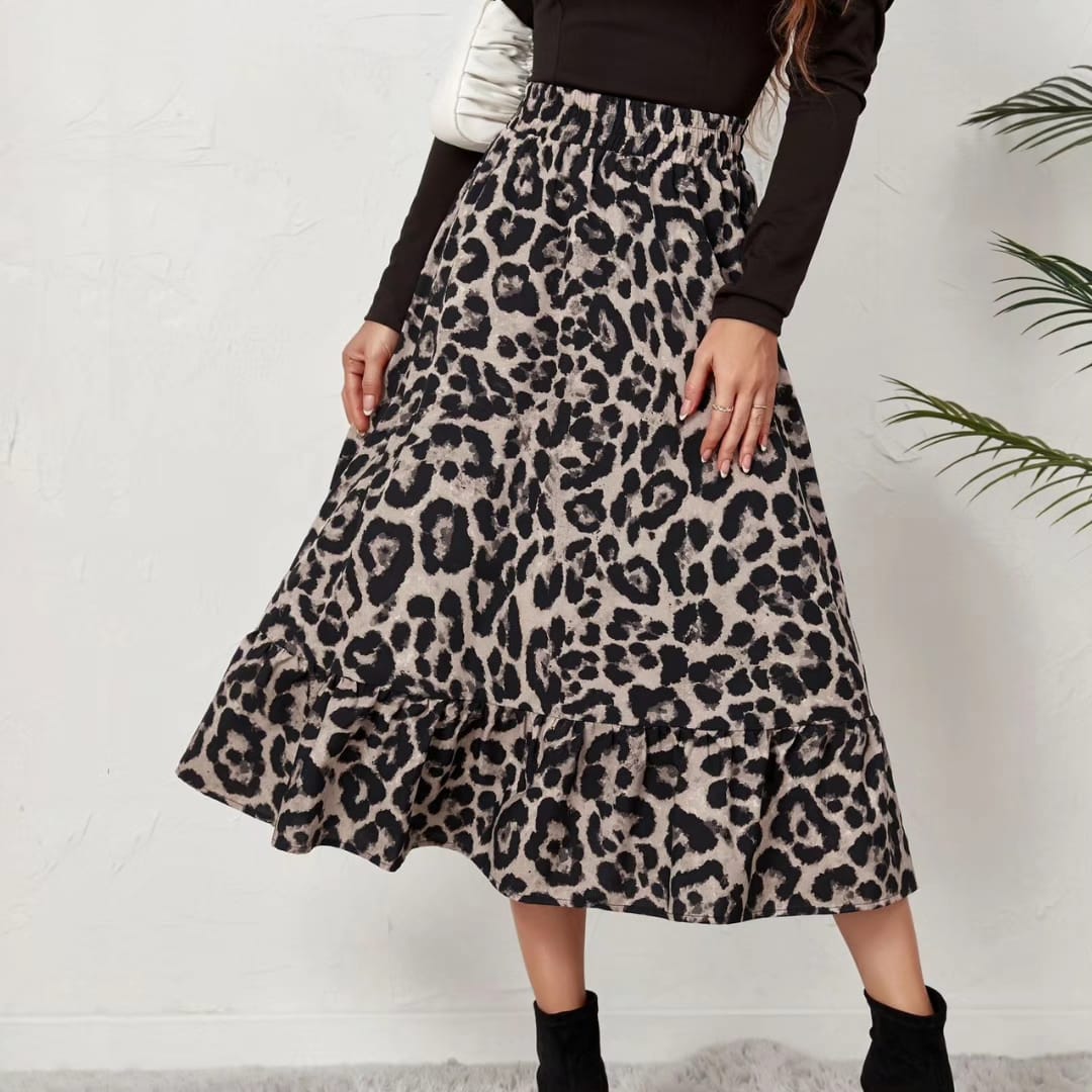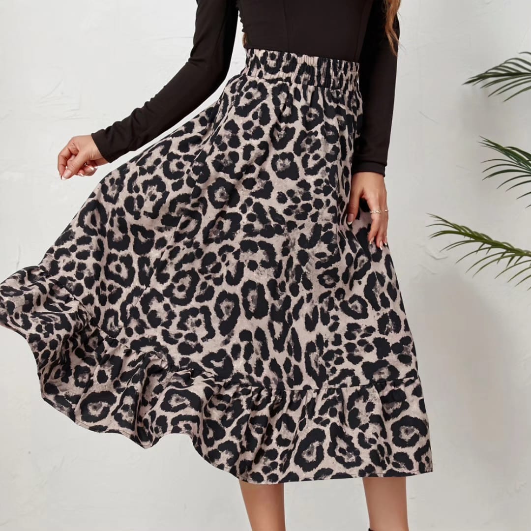 Trendy spring chiffon midi skirt with a bold leopard pattern, perfect for chic and versatile styling.
